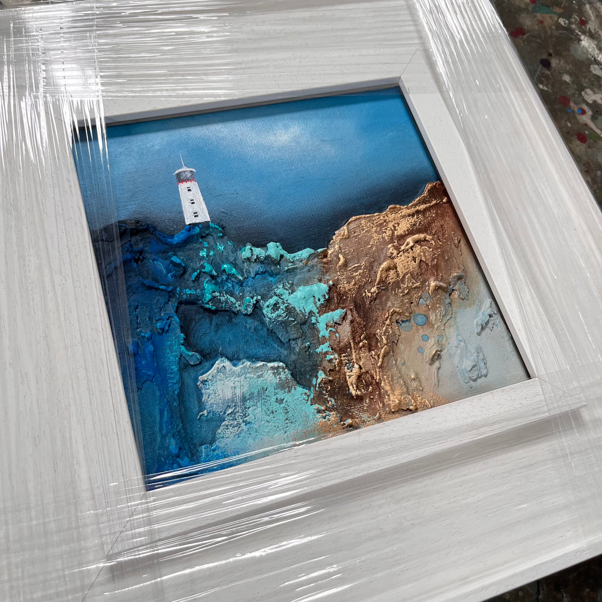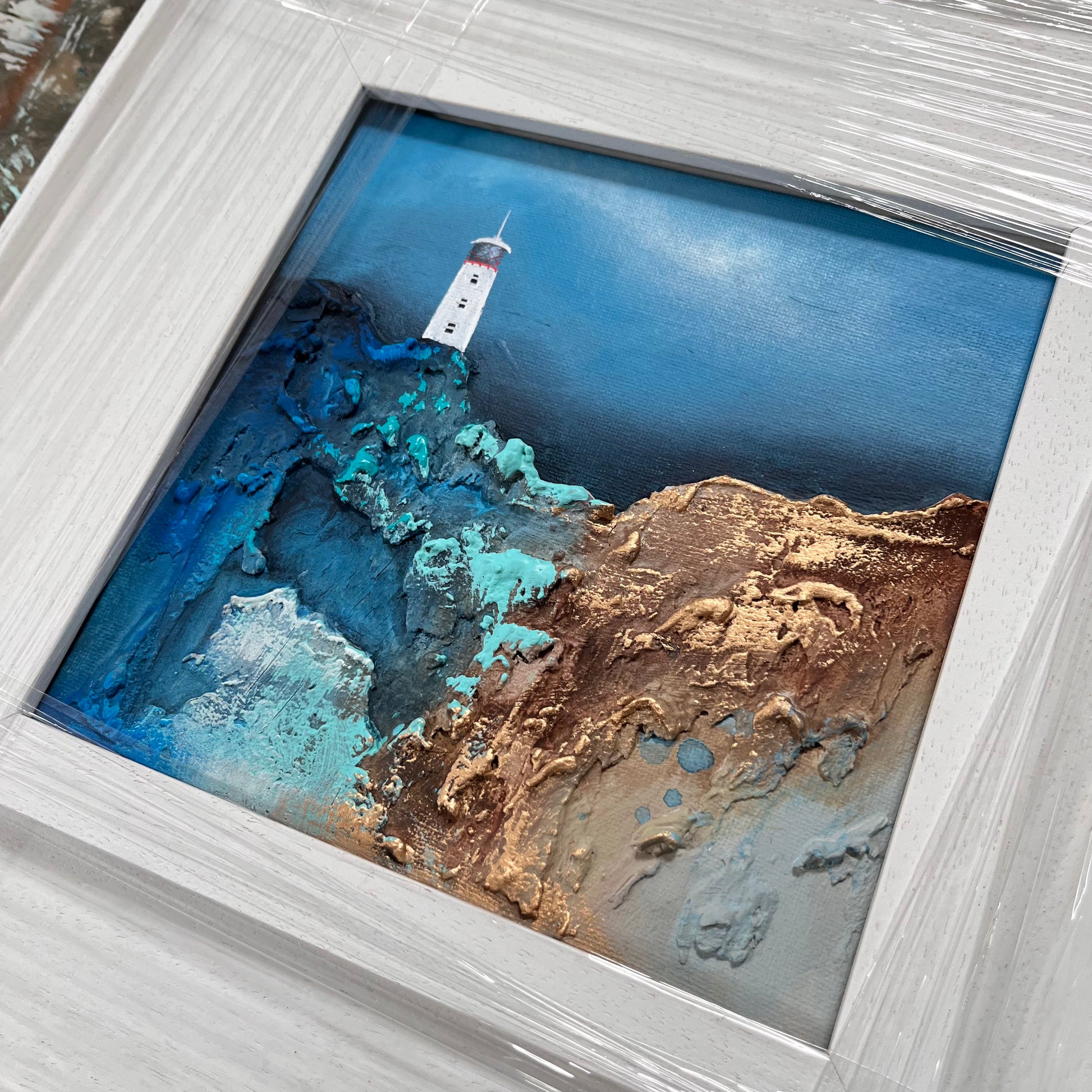 Part of the ongoing “A Lonely Lighthouse” subseries, this textured piece explores the sense of quiet wonder I felt during coastal holidays on Ireland’s rugged west coast. As a child, lighthouses always seemed impossibly tall and mysterious—standing alone against vast skies and endless seas.