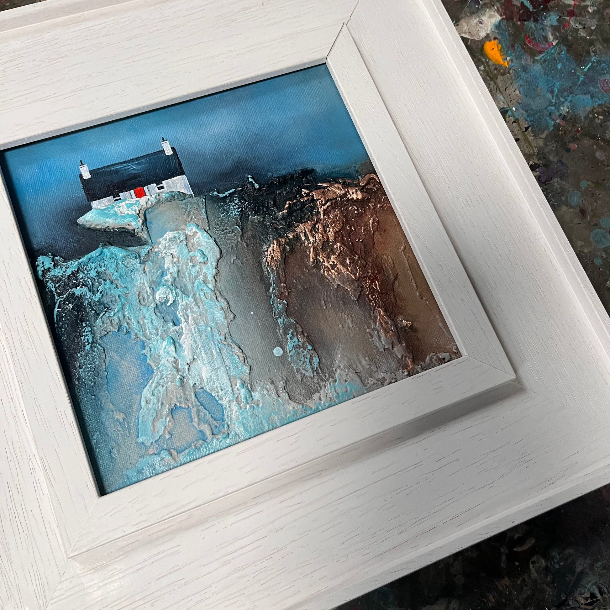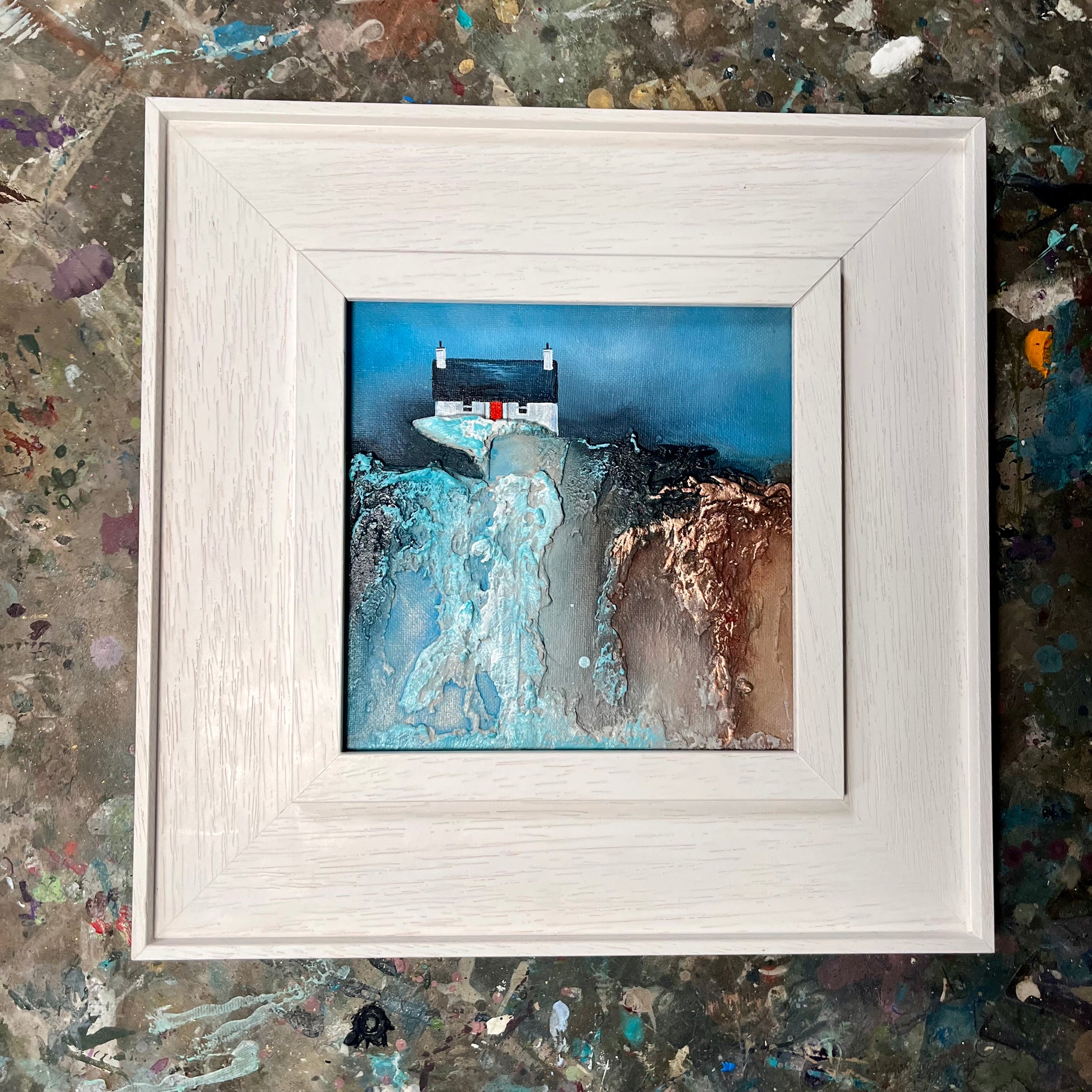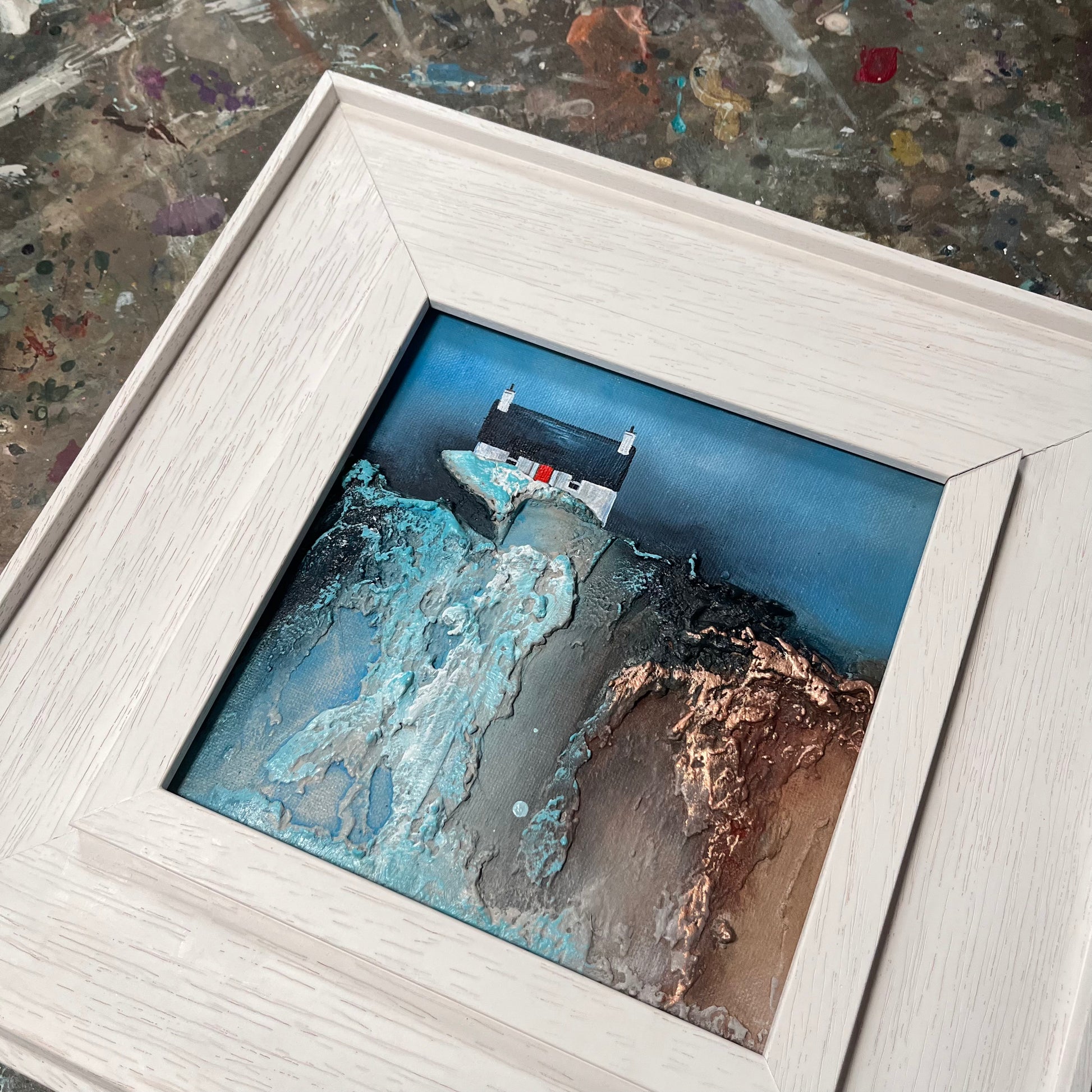 The piece draws from the visual language of childhood—rich textures, bold contrasts, and simplified forms—to evoke how the world once felt: larger, more mysterious, and filled with quiet beauty. The interplay between earthy tones and vivid blues emphasises the rugged charm of the landscape, while the solitary structure anchors the composition with a quiet presence.