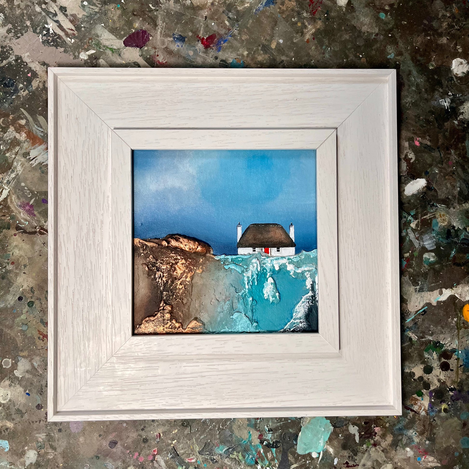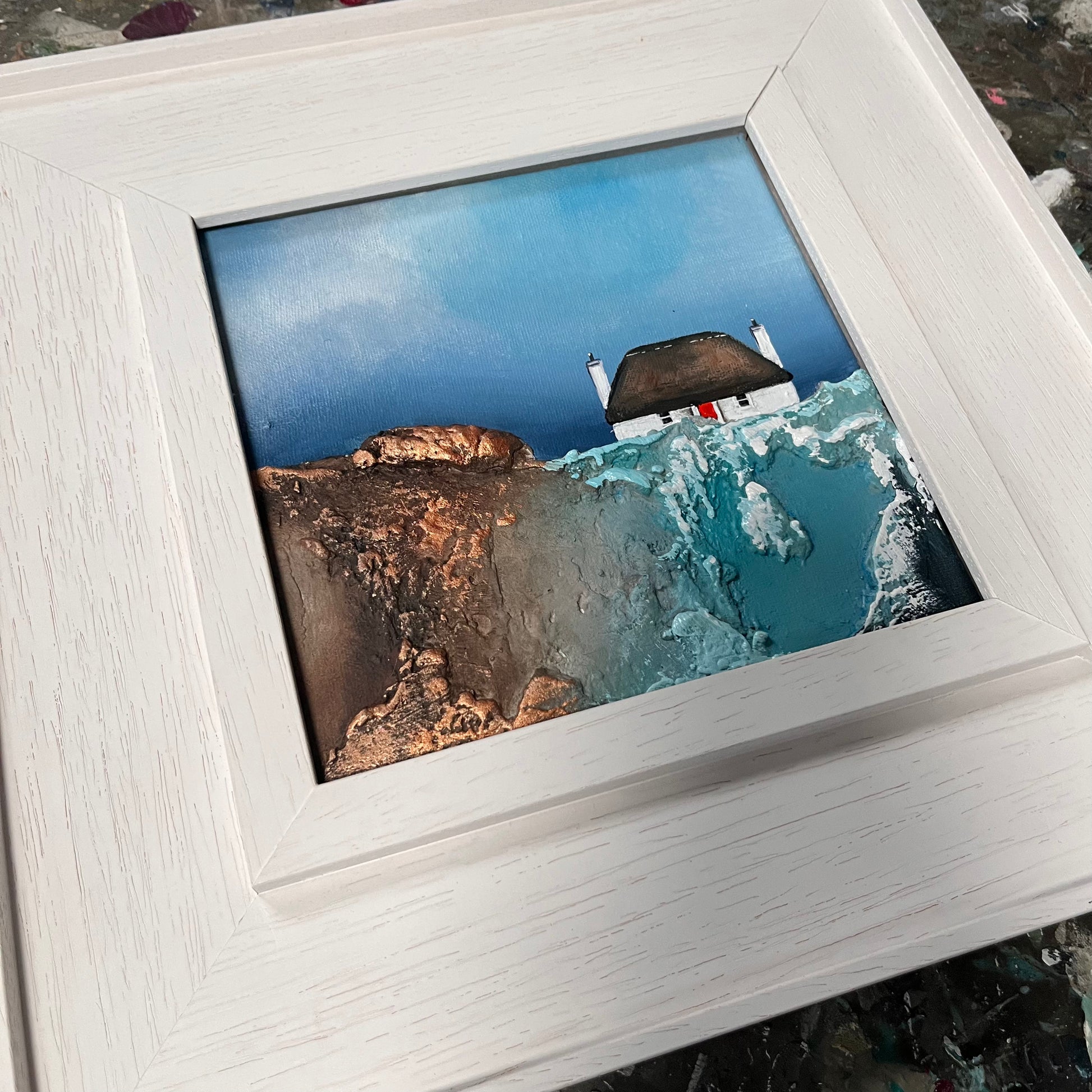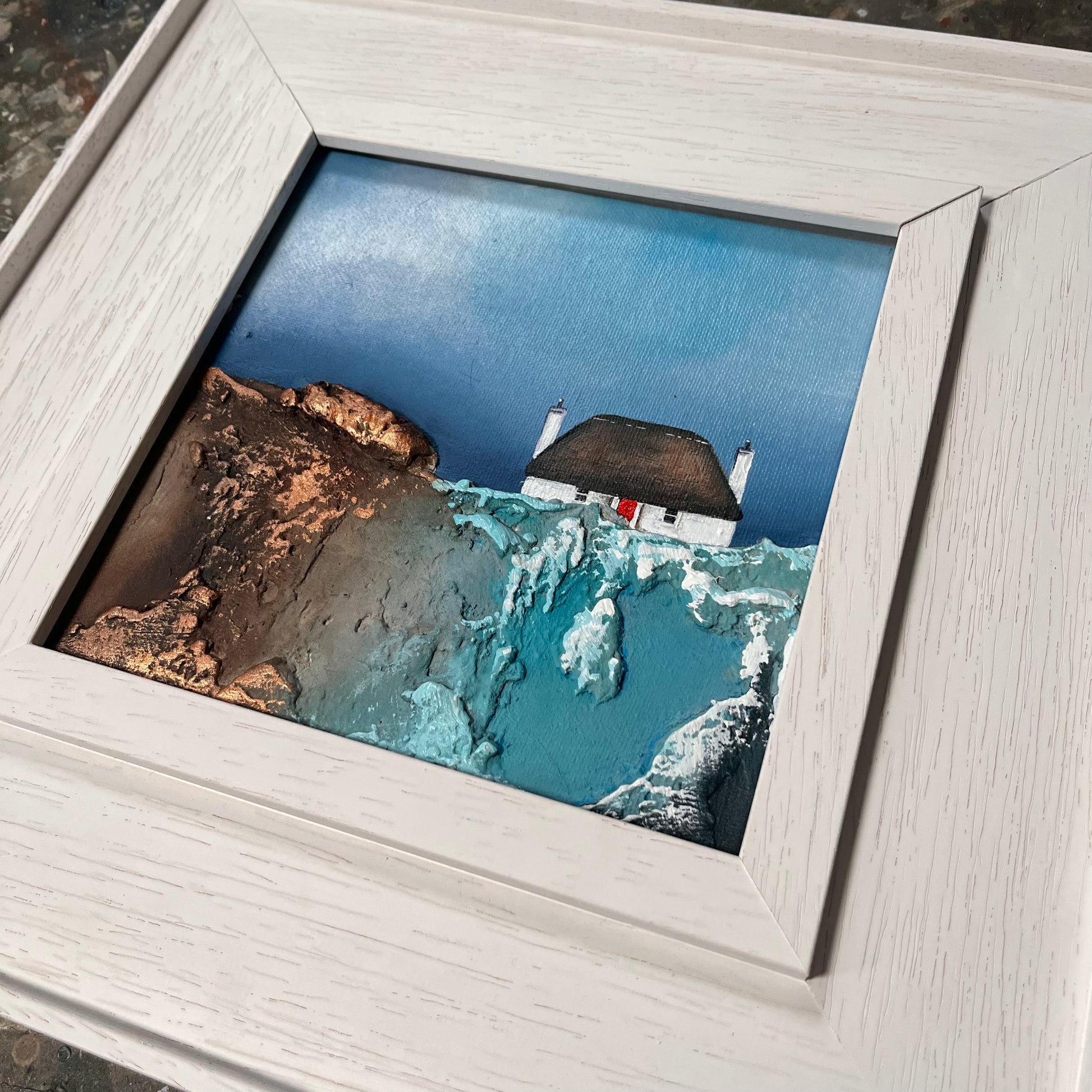 The piece draws from the visual language of childhood—rich textures, bold contrasts, and simplified forms—to evoke how the world once felt: larger, more mysterious, and filled with quiet beauty. The interplay between earthy tones and vivid blues emphasises the rugged charm of the landscape, while the solitary structure anchors the composition with a quiet presence.