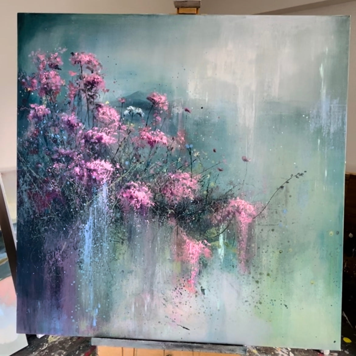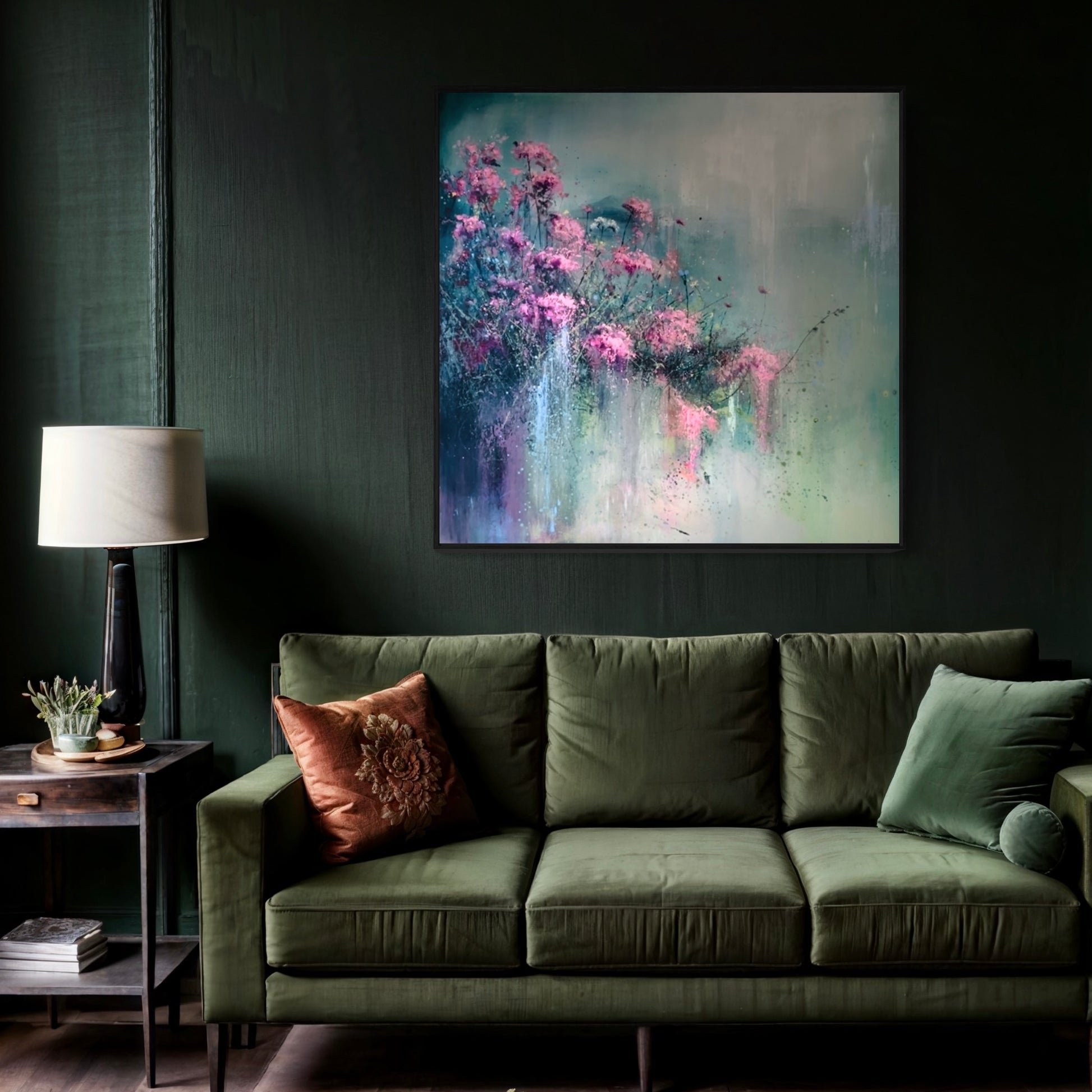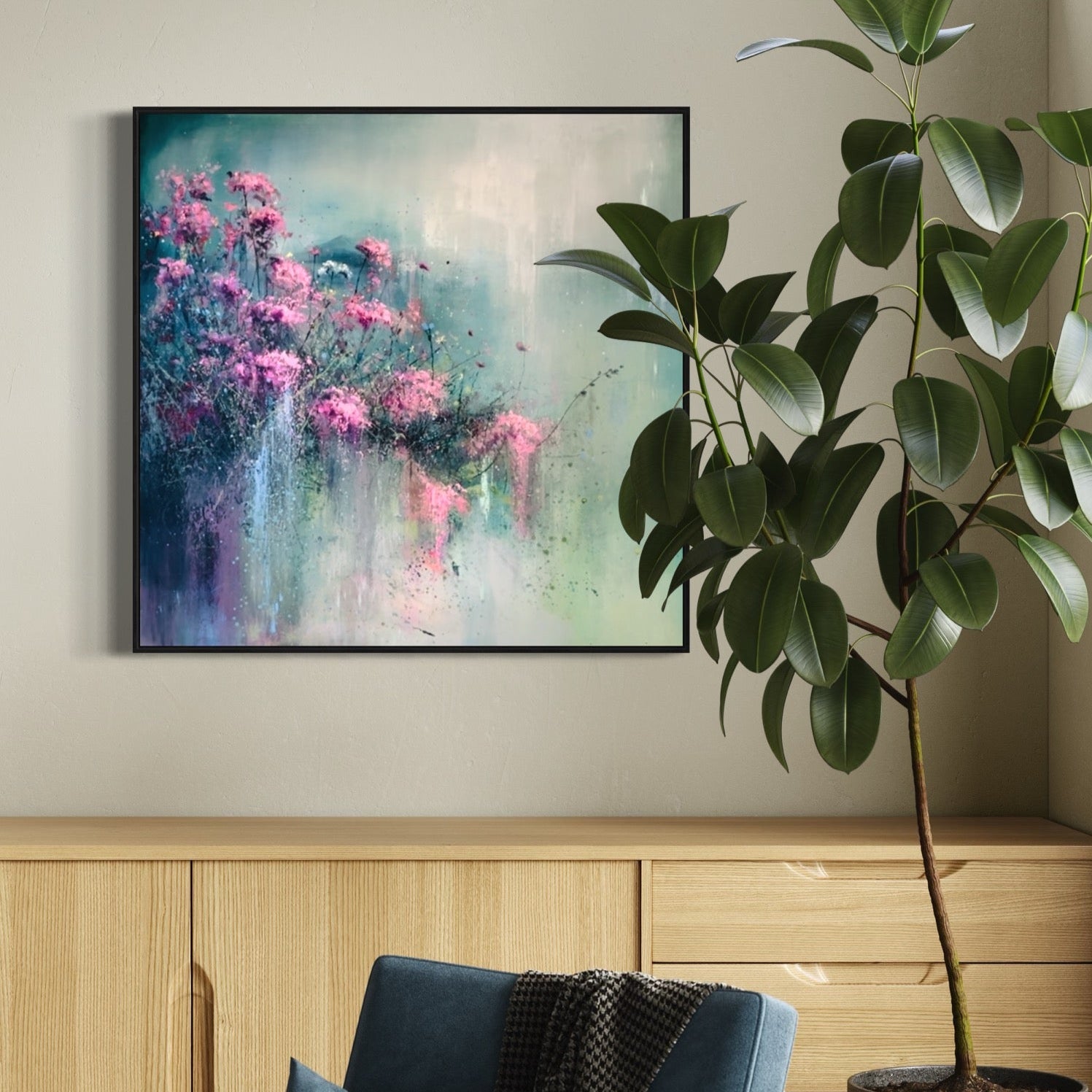 Bring a touch of gentle beauty into your home with "I Must Have Flowers". This elegant piece features soft pink florals set against a dreamy, misty background, blending delicate shades of green, white, and blush tones; creating a sense of calm, like a quiet meadow touched by early morning light.
