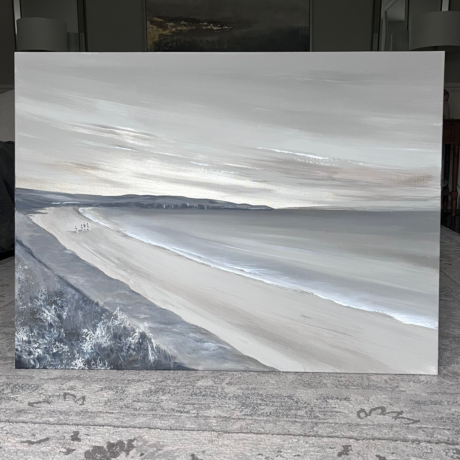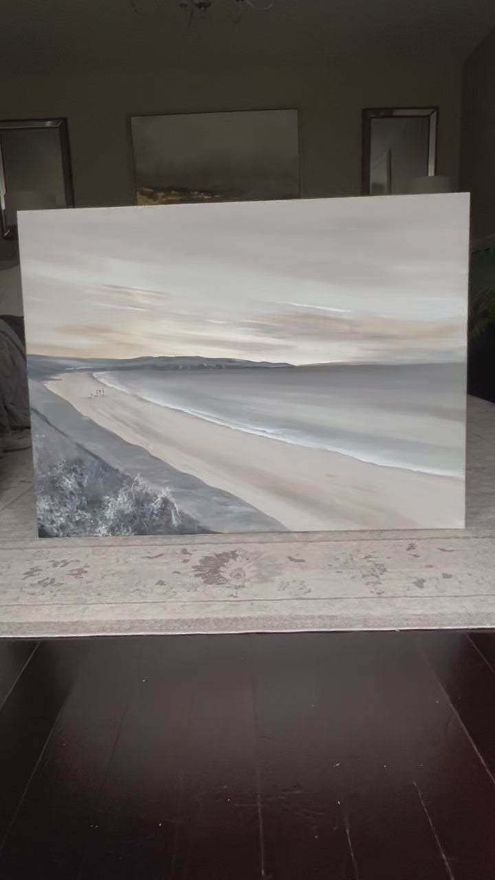 Bring the calming essence of the coast into your space with “Seaside Stroll”, a serene seascape that captures the quiet beauty of a wide, open beach stretching gently into the distance. Rendered in soft, monochromatic tones of grey, ivory, and muted blues, this painting evokes a sense of peace and timelessness.