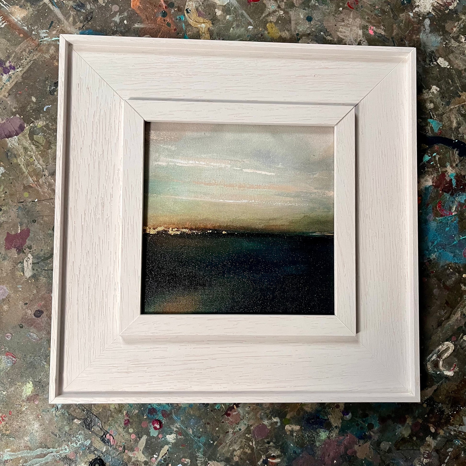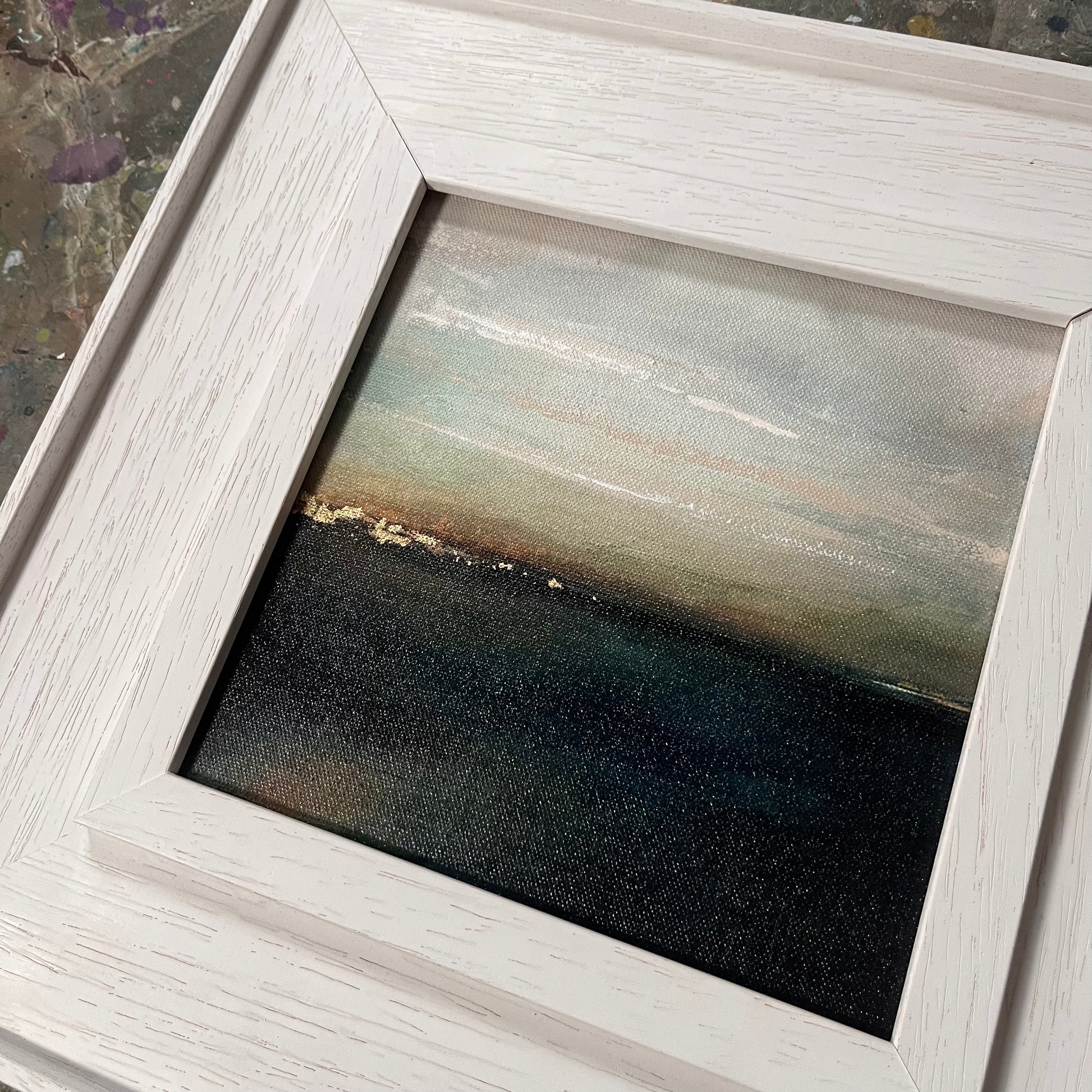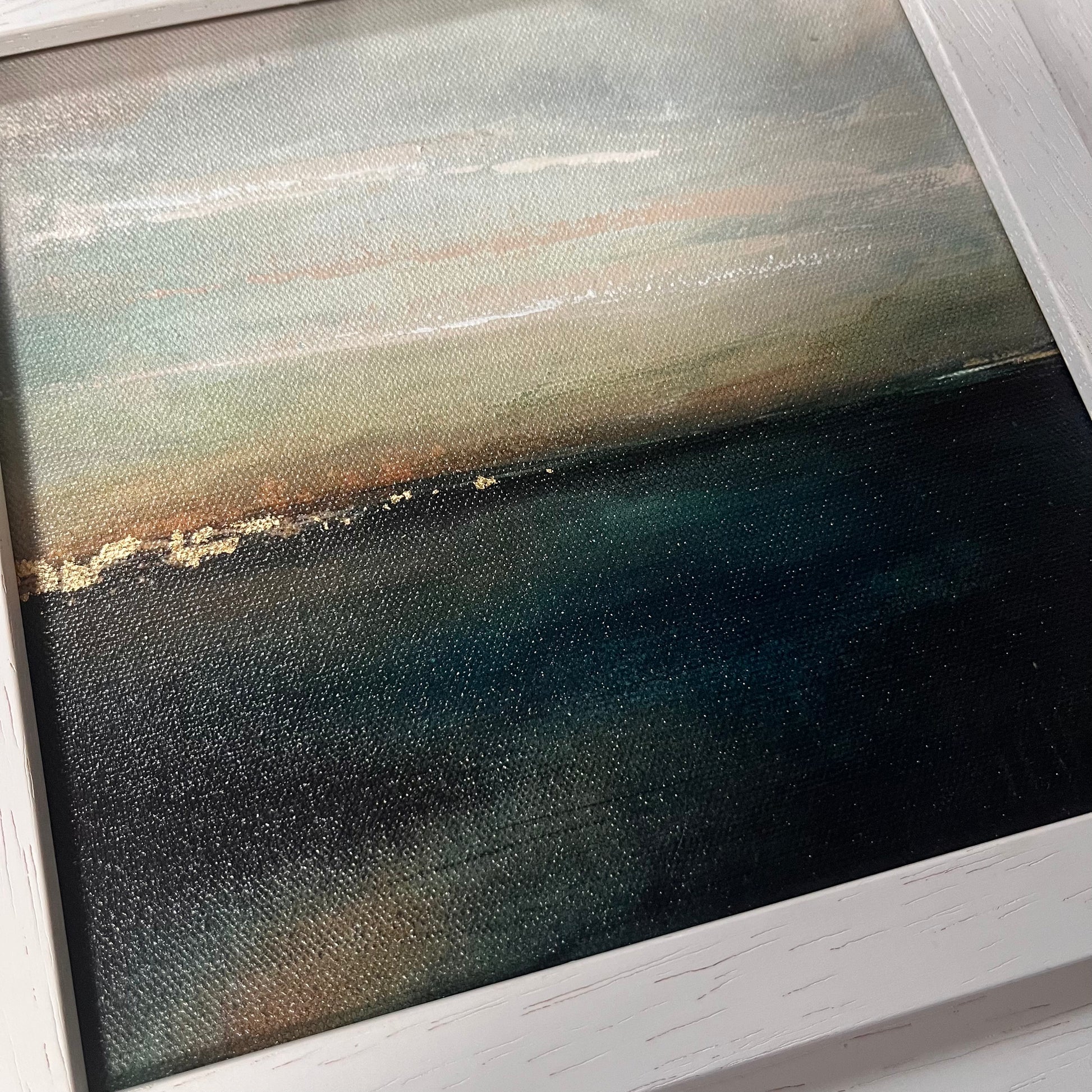 Immerse yourself in the serene beauty of Cold Water, a captivating abstract painting that evokes the quiet mystery of vast open waters. With a soothing gradient of soft whites, deep blues, and inky blacks, this piece captures the essence of a distant horizon where sky meets sea. The subtle blending of colours and delicate texture create a sense of calm and depth, making it a perfect addition to any modern, minimalist, or coastal-inspired space. It's created through layered paint and acrylic ink, with a delicate touch of gold leaf running through the composition. The contrast of moody, atmospheric tones and shimmering metallic detail gives it depth and movement, capturing the feeling of shifting skies and rugged horizons. A piece that invites you to pause, look closer, and lose yourself in its quiet intensity.