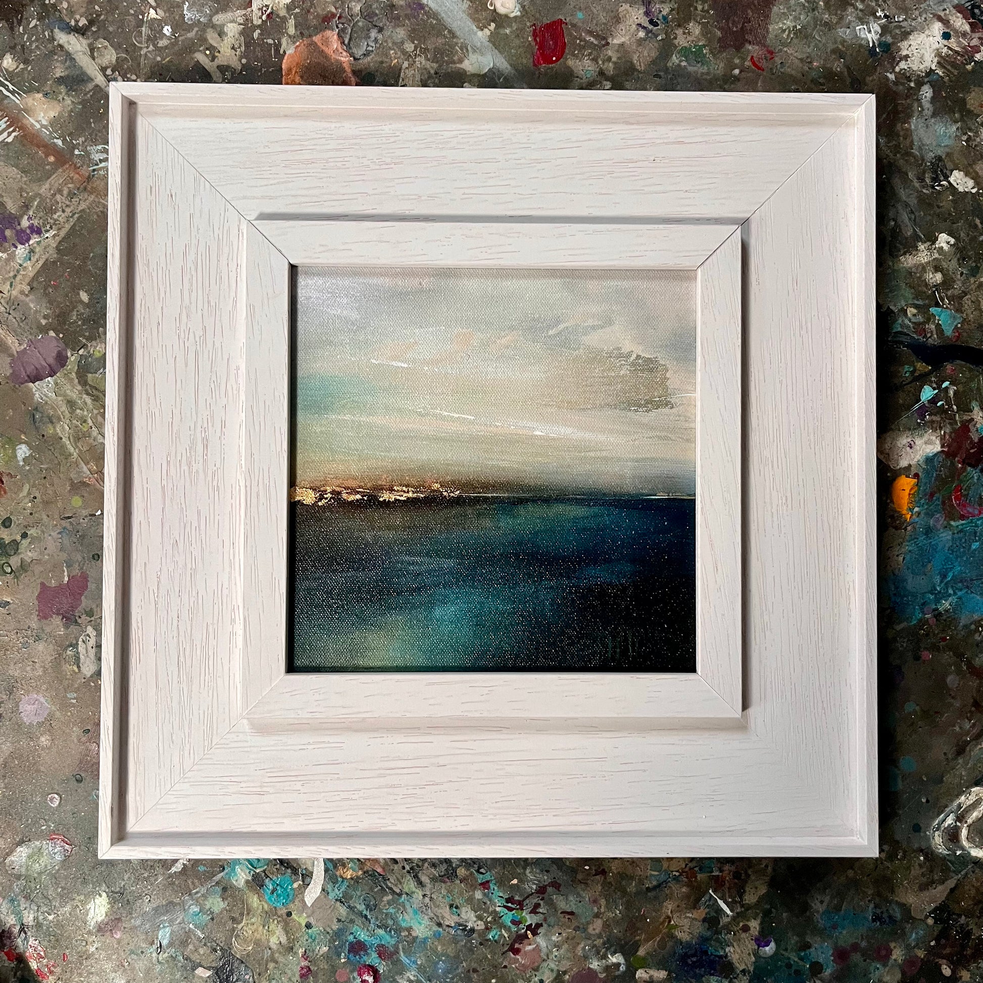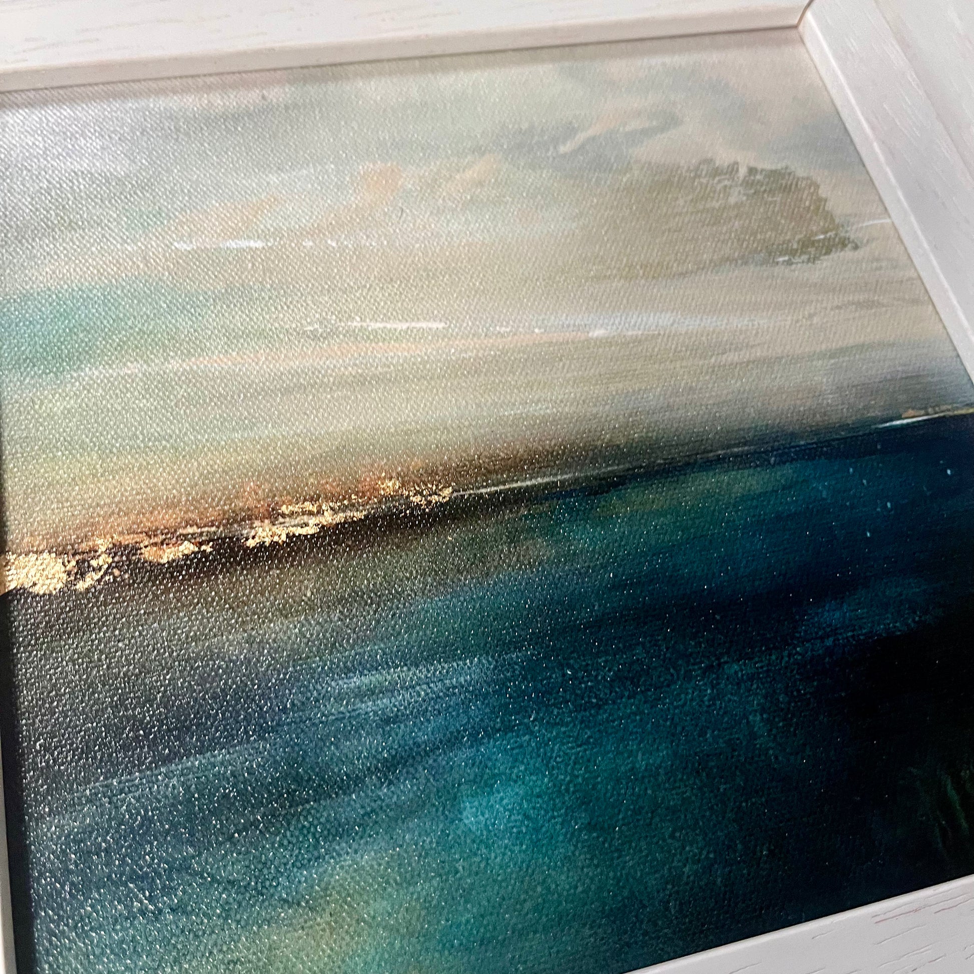 Immerse yourself in the serene beauty of Cold Water, a captivating abstract painting that evokes the quiet mystery of vast open waters. With a soothing gradient of soft whites, deep blues, and inky blacks, this piece captures the essence of a distant horizon where sky meets sea. The subtle blending of colours and delicate texture create a sense of calm and depth, making it a perfect addition to any modern, minimalist, or coastal-inspired space. It's created through layered paint and acrylic ink, with a delicate touch of gold leaf running through the composition. The contrast of moody, atmospheric tones and shimmering metallic detail gives it depth and movement, capturing the feeling of shifting skies and rugged horizons. A piece that invites you to pause, look closer, and lose yourself in its quiet intensity.