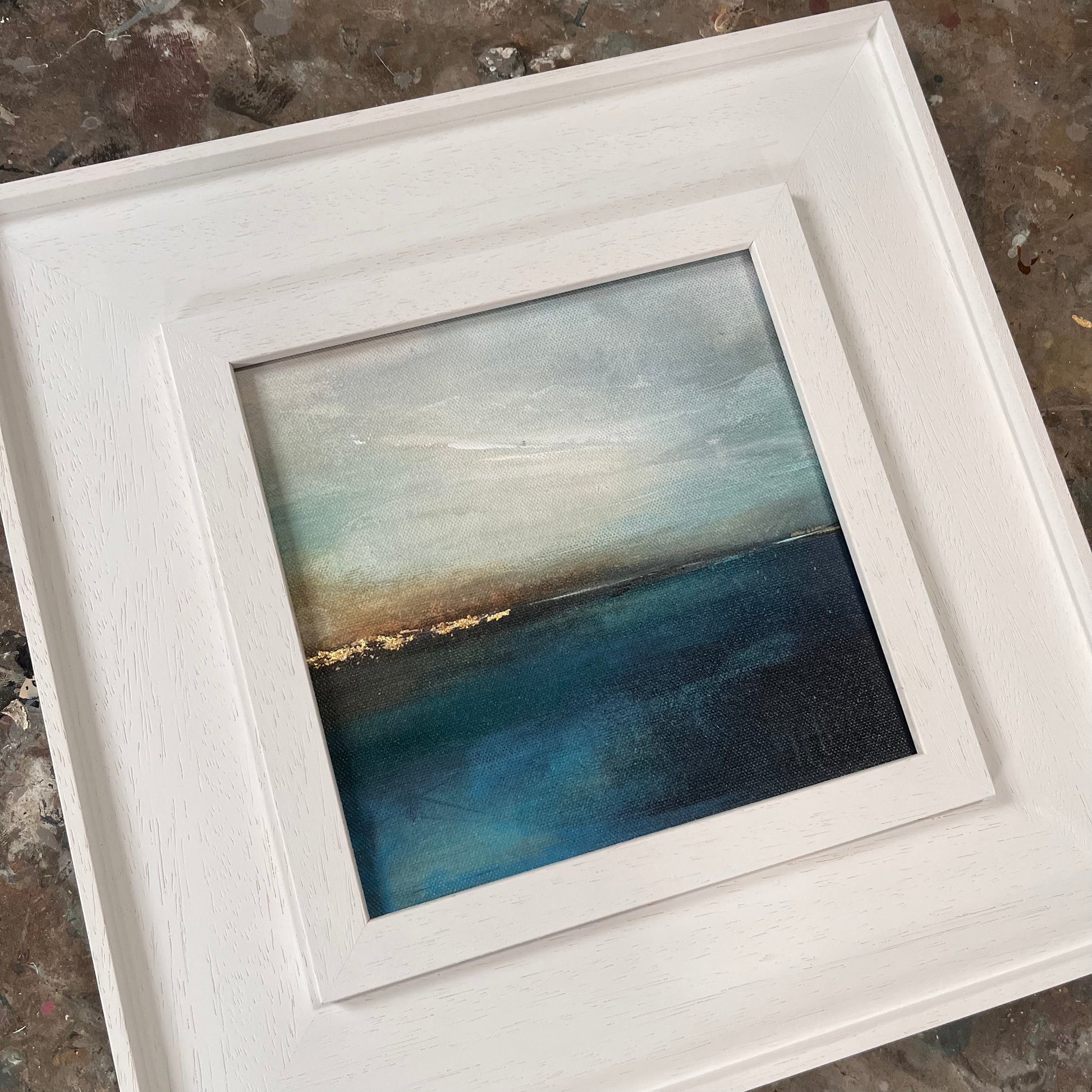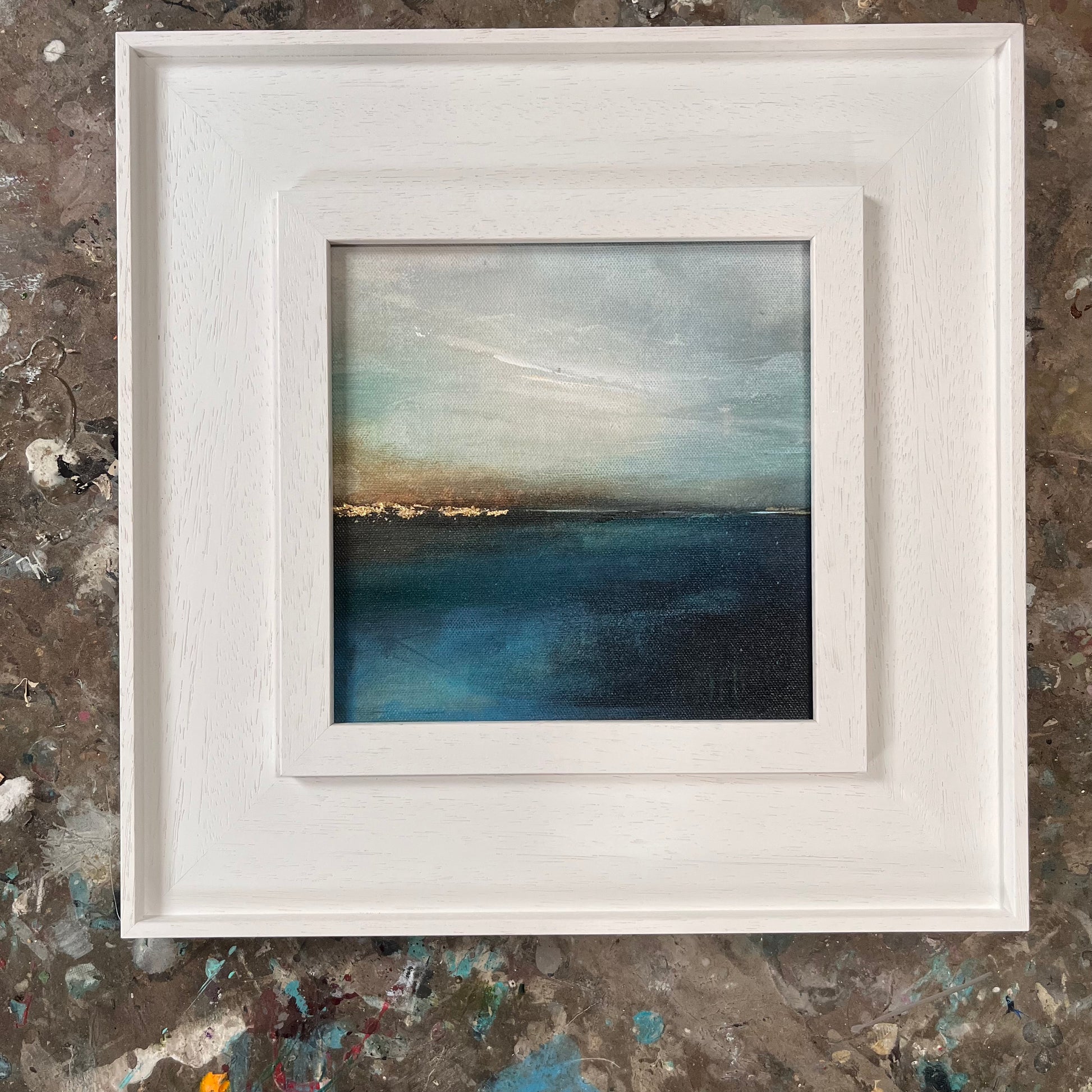 Immerse yourself in the serene beauty of Cold Water, a captivating abstract painting that evokes the quiet mystery of vast open waters. With a soothing gradient of soft whites, deep blues, and inky blacks, this piece captures the essence of a distant horizon where sky meets sea. The subtle blending of colours and delicate texture create a sense of calm and depth, making it a perfect addition to any modern, minimalist, or coastal-inspired space. It's created through layered paint and acrylic ink, with a delicate touch of gold leaf running through the composition. The contrast of moody, atmospheric tones and shimmering metallic detail gives it depth and movement, capturing the feeling of shifting skies and rugged horizons. A piece that invites you to pause, look closer, and lose yourself in its quiet intensity.