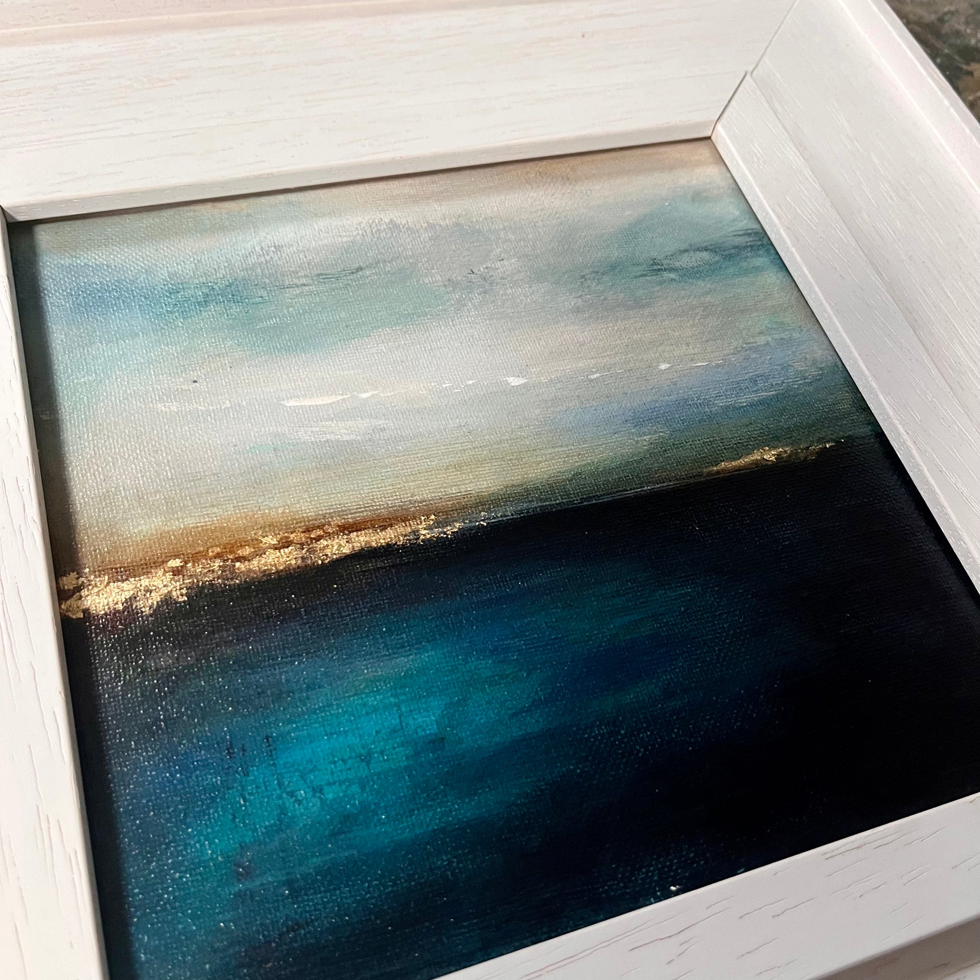 Immerse yourself in the serene beauty of Cold Water, a captivating abstract painting that evokes the quiet mystery of vast open waters. With a soothing gradient of soft whites, deep blues, and inky blacks, this piece captures the essence of a distant horizon where sky meets sea. The subtle blending of colours and delicate texture create a sense of calm and depth, making it a perfect addition to any modern, minimalist, or coastal-inspired space. It's created through layered paint and acrylic ink, with a delicate touch of gold leaf running through the composition. The contrast of moody, atmospheric tones and shimmering metallic detail gives it depth and movement, capturing the feeling of shifting skies and rugged horizons. A piece that invites you to pause, look closer, and lose yourself in its quiet intensity.