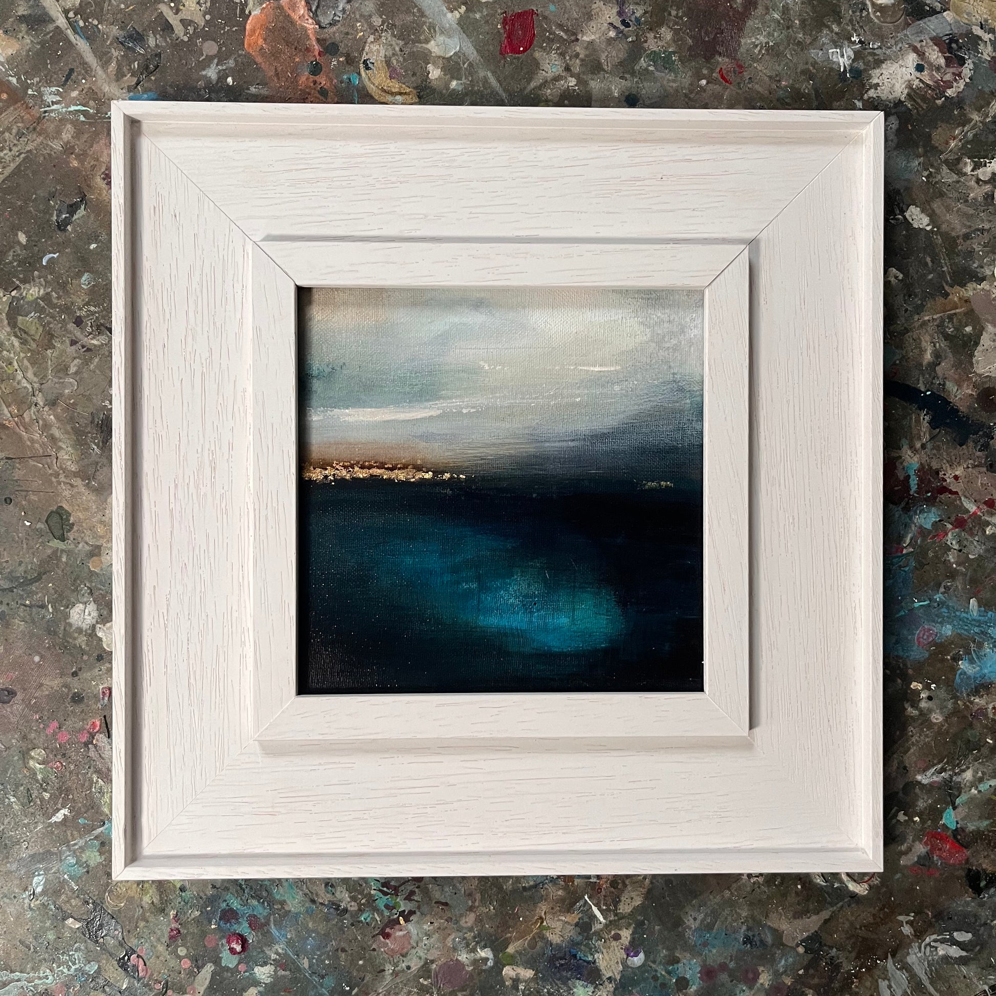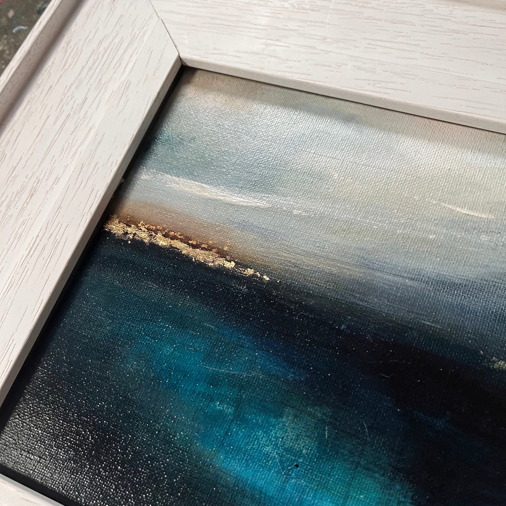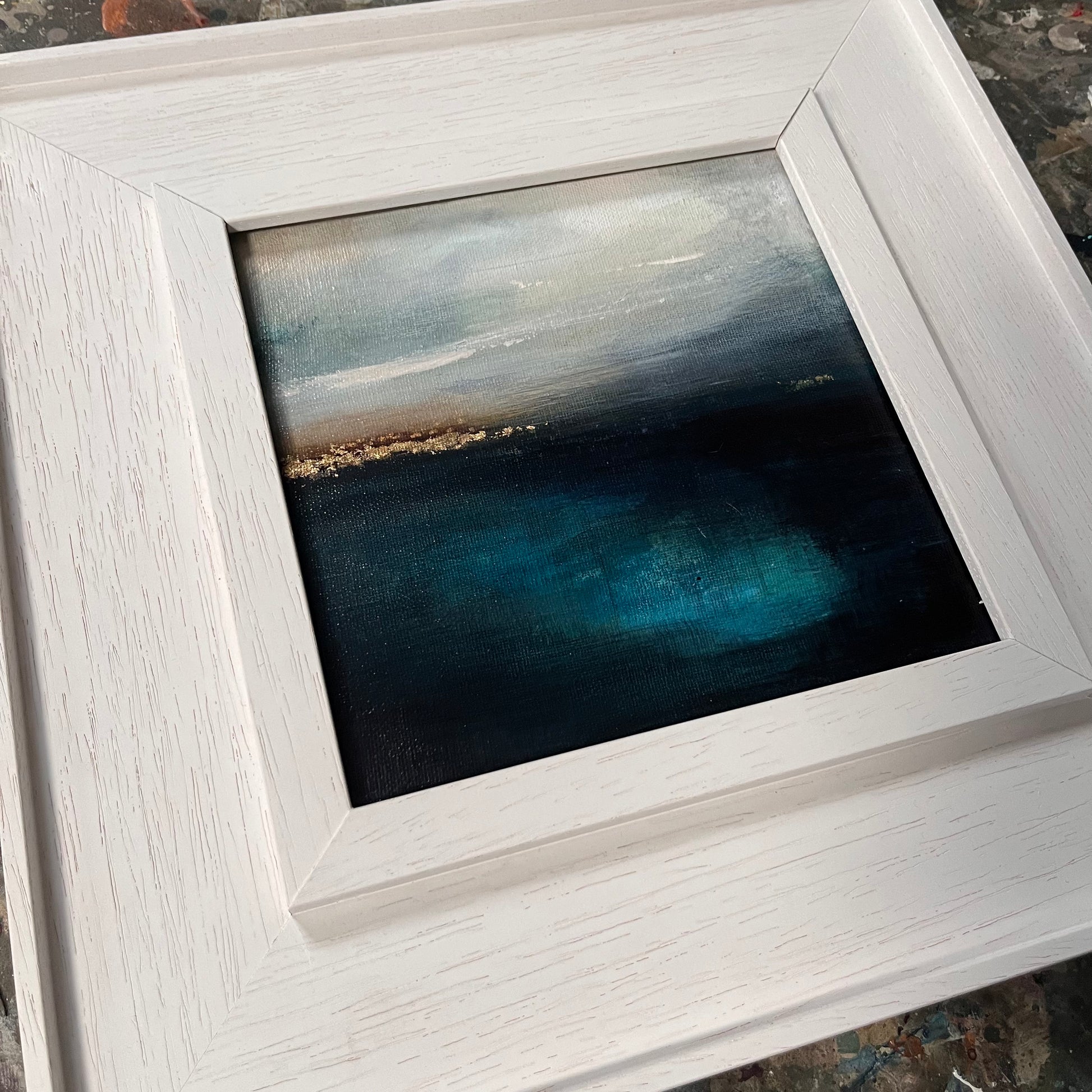 Immerse yourself in the serene beauty of Cold Water, a captivating abstract painting that evokes the quiet mystery of vast open waters. With a soothing gradient of soft whites, deep blues, and inky blacks, this piece captures the essence of a distant horizon where sky meets sea. The subtle blending of colours and delicate texture create a sense of calm and depth, making it a perfect addition to any modern, minimalist, or coastal-inspired space. It's created through layered paint and acrylic ink, with a delicate touch of gold leaf running through the composition. The contrast of moody, atmospheric tones and shimmering metallic detail gives it depth and movement, capturing the feeling of shifting skies and rugged horizons. A piece that invites you to pause, look closer, and lose yourself in its quiet intensity.