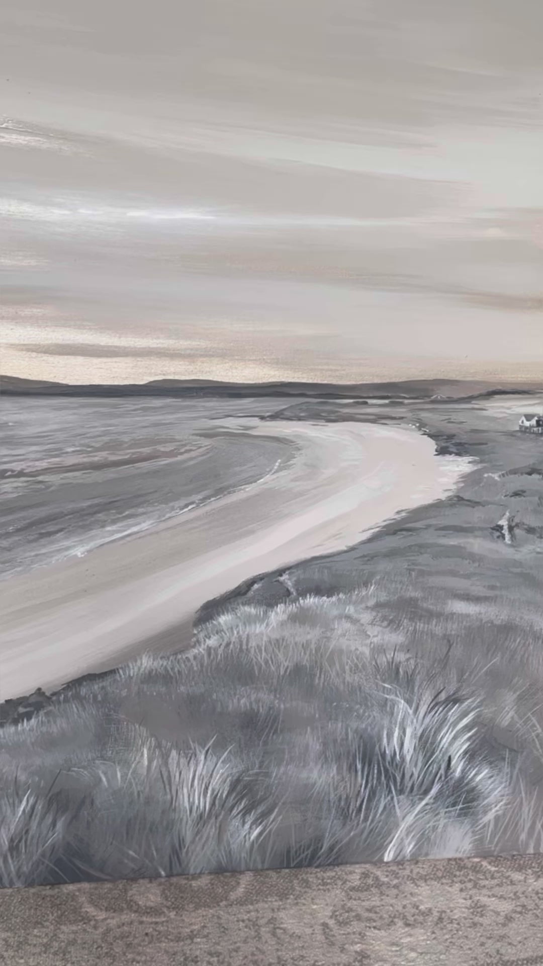 "Rossnowlagh" is a tranquil beachscape featuring soft, neutral tones and a subtle sunset. The scene includes partial sand dunes in the foreground, creating a serene and calming atmosphere. The addition of luxurious gold paint elevates the artwork, adding an understated sophistication. This piece is designed to enhance any room with its gentle, soothing palette and elegant details, making it a perfect choice for those seeking to create a peaceful ambiance in their space. Its muted colours and refined touches offer a balanced and tasteful addition to your home decor.