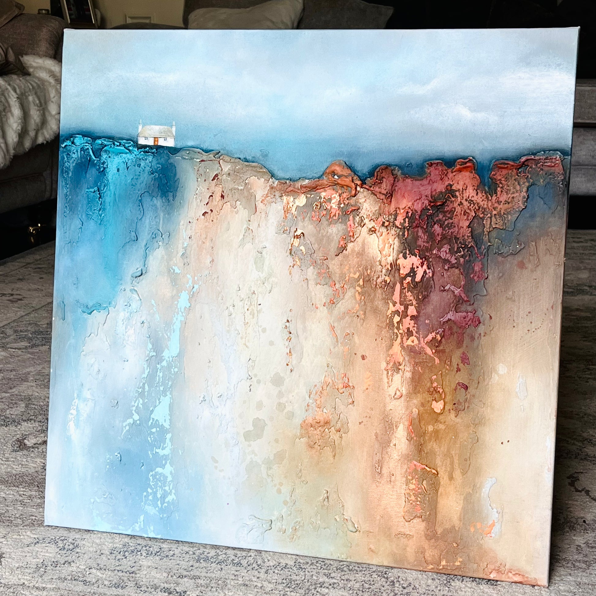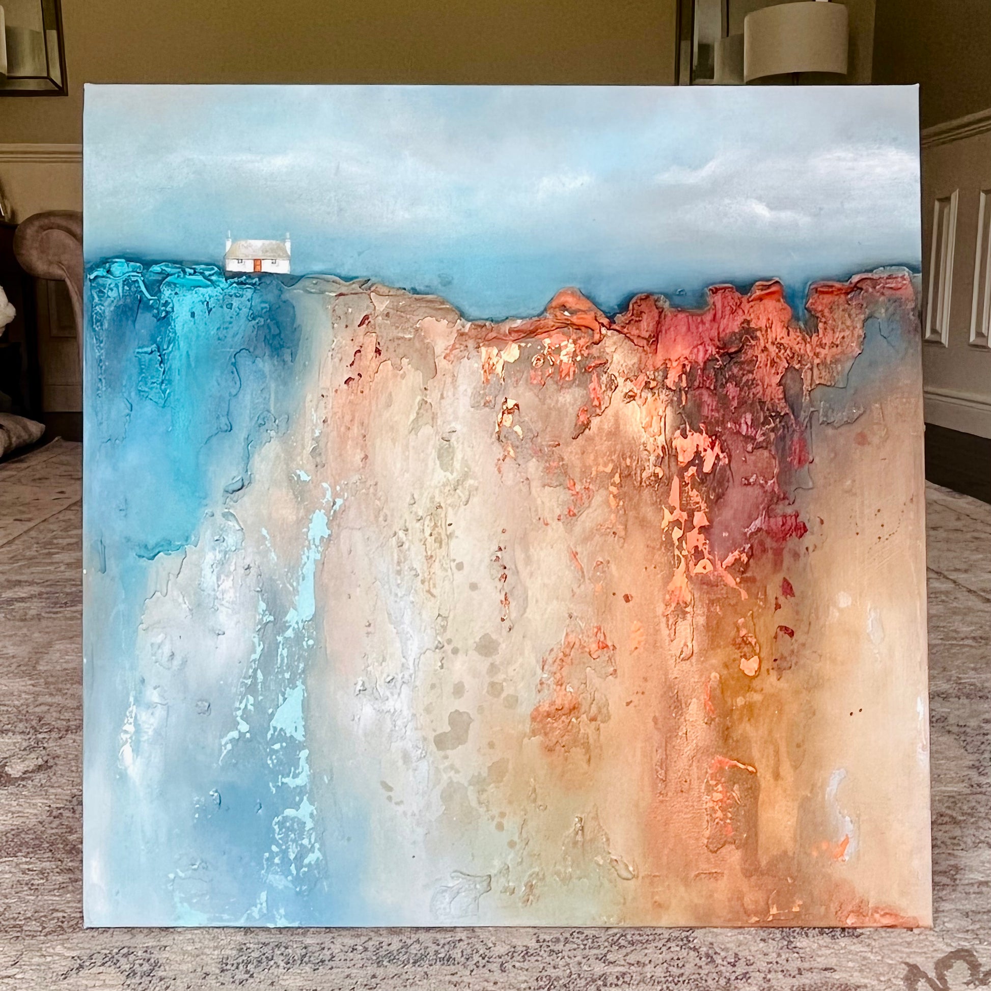 ‘Spancill Hill’ is a mixed media, and you may realise by the name is named after an Irish Folk song. My childhood series are a stylised naively painted depiction of my time on holidays in the west coast of Ireland as a child; rugged land, whitewashed cottages, a time when everything seemed so vast, hence the exaggerated horizon line. I’m pretty sure we only had one double cassette tape of The Dubliners that was played over and over again as we journeyed around with a caravan in tow.