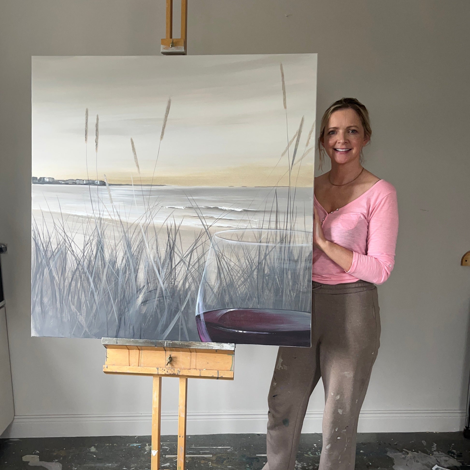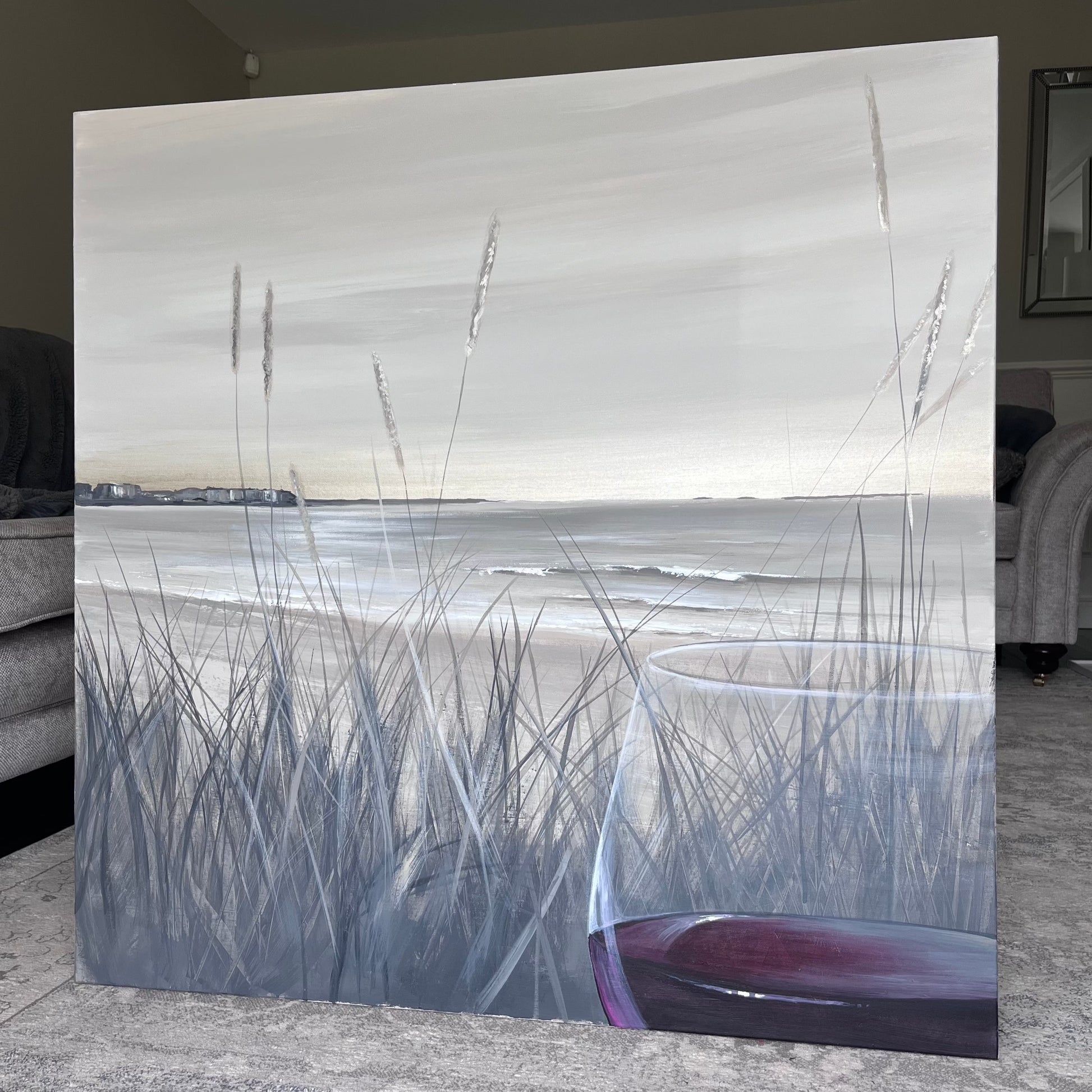 "Time for Wine" is a playful and relaxing artwork, featuring the serene beauty of a beach with a large glass of wine prominently in the foreground. Ideal for a kitchen or dining area, it combines neutral tones with vibrant pops of colour from the wine and the reflective gold of the sunset, adding a touch of luxury to any room. The harmonious blend of calming beach scenery and the inviting allure of the wine glass makes this piece a perfect addition to create a cozy and elegant atmosphere in your home.