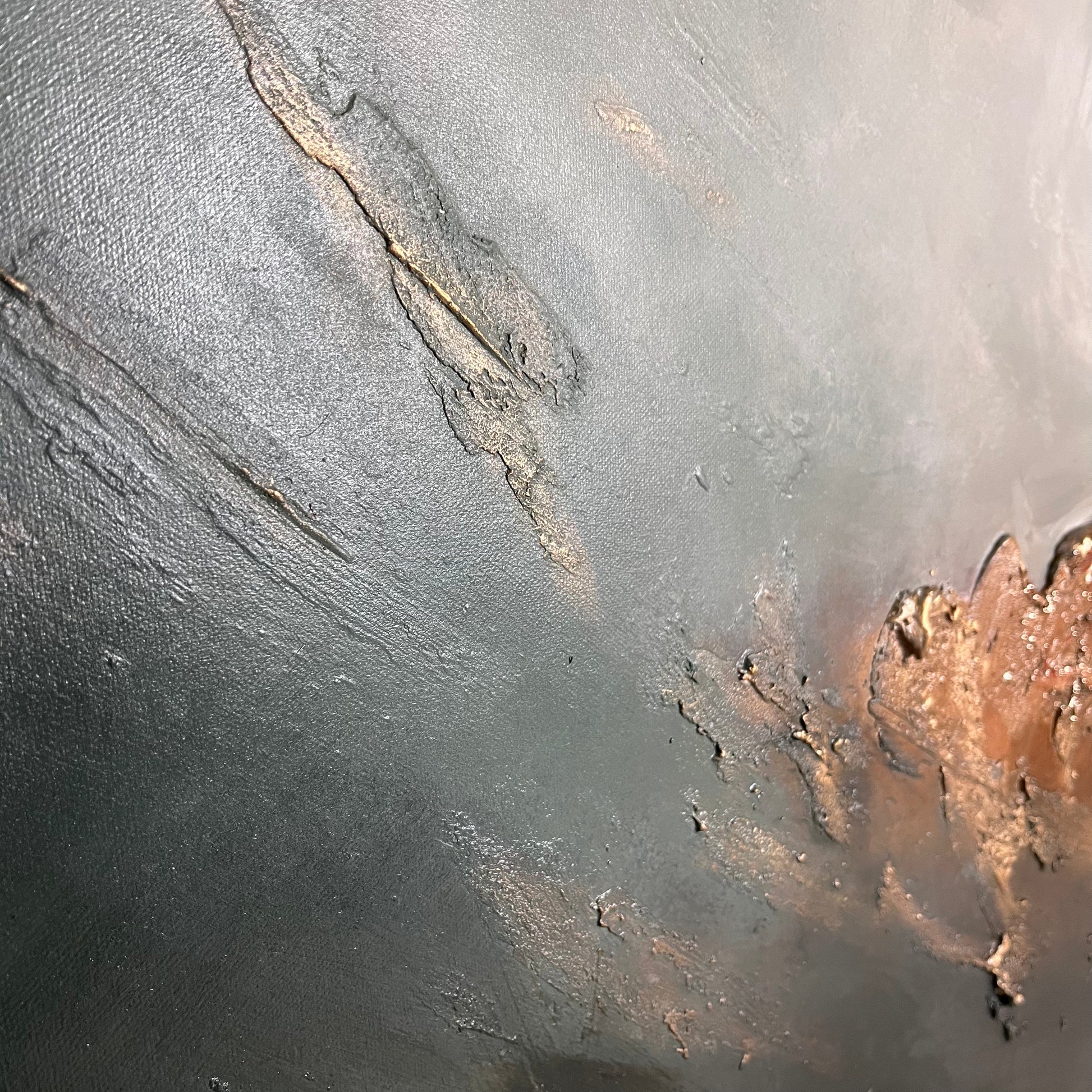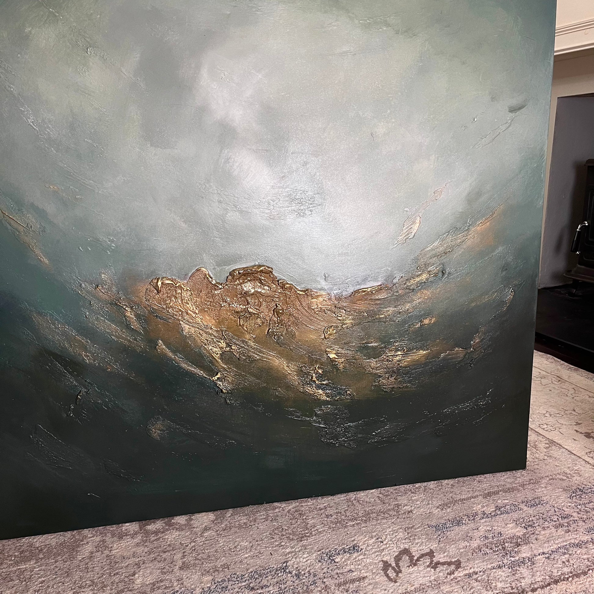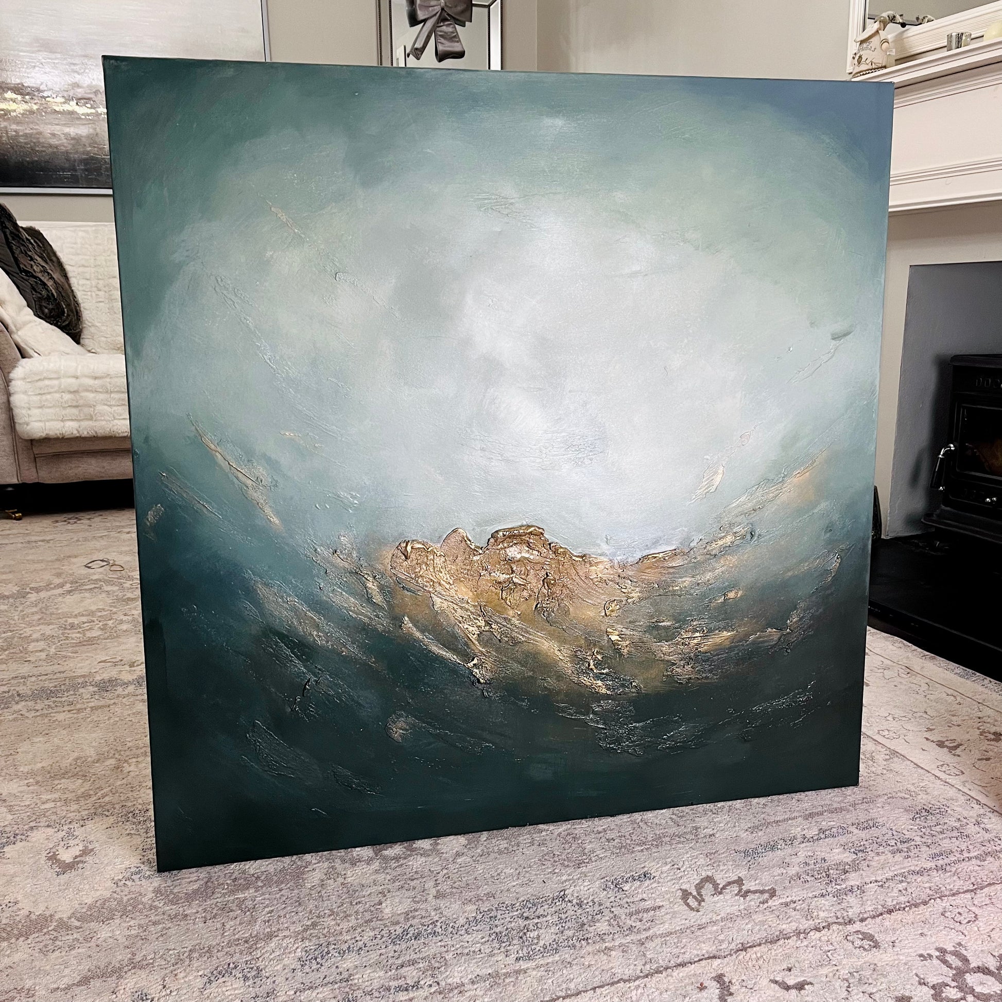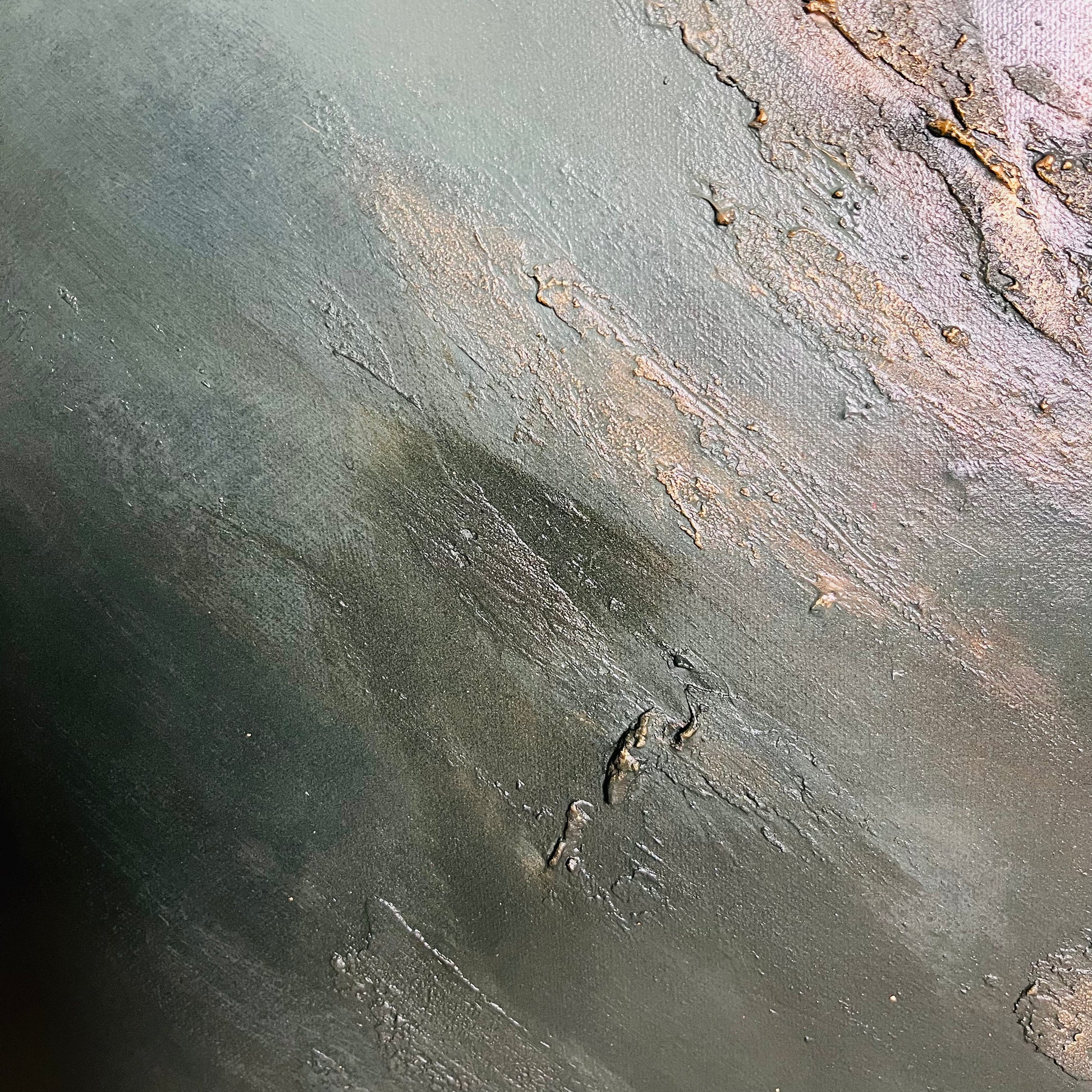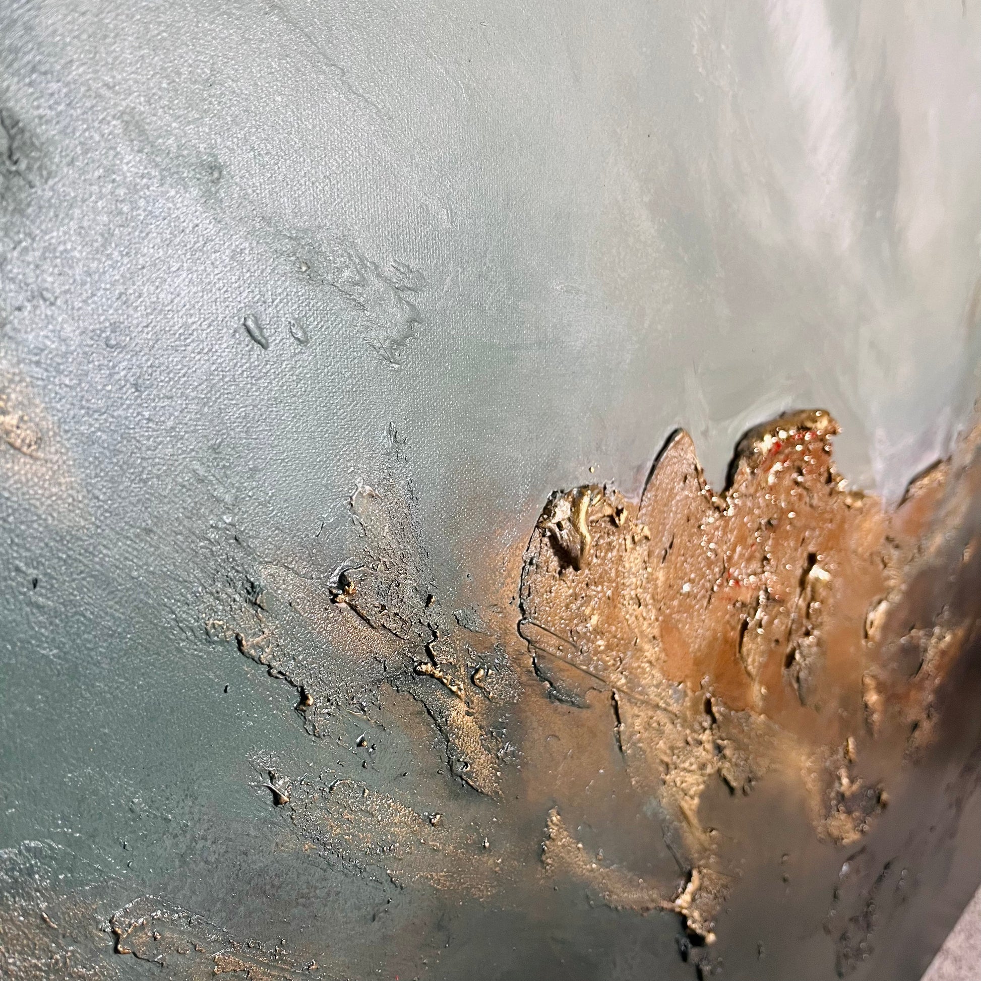 A mixed media abstract with heavy texture and painted with muted blues, taupes, golds and gold leaf. This is definitely not a wallflower! Framing can be arranged if needed.