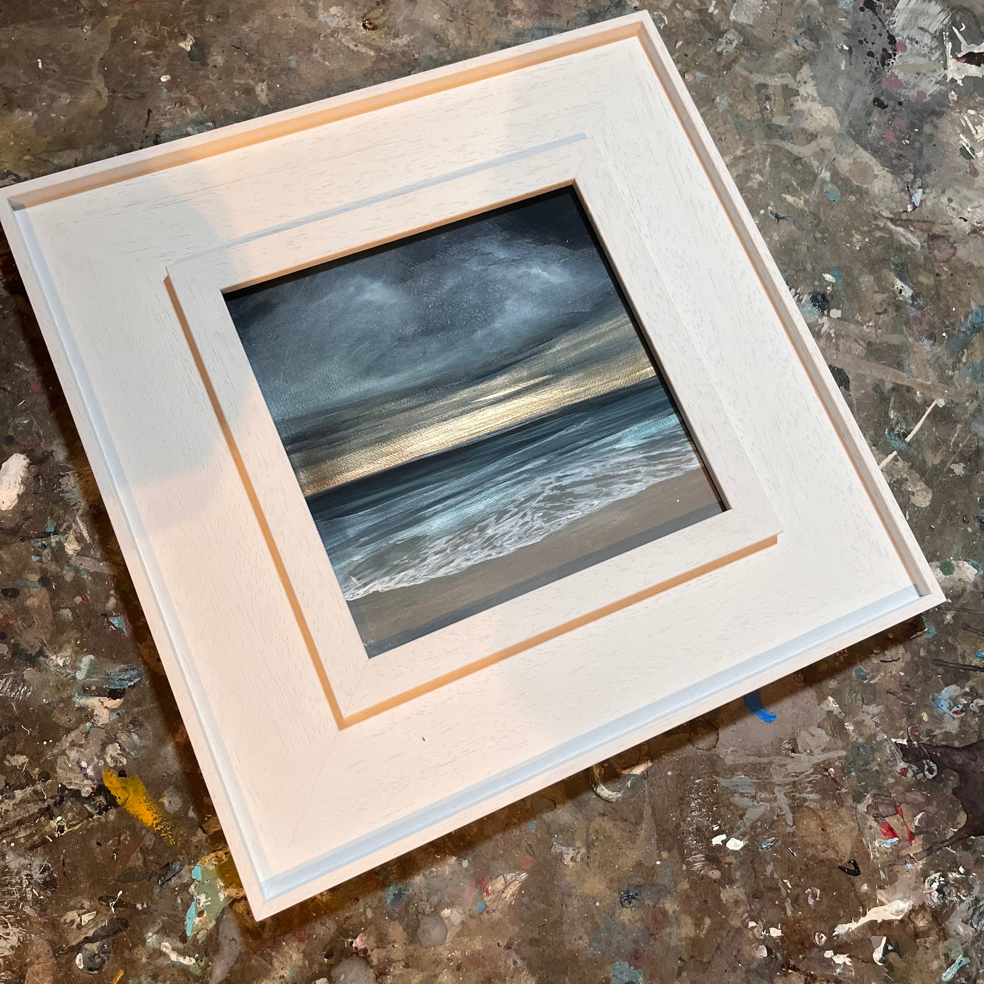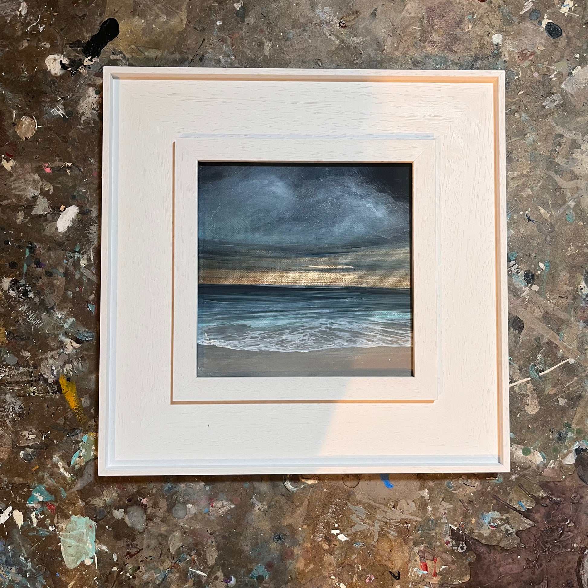 This framed 20x20cm canvas captures the atmosphere of a misty Irish shoreline, where sea foam drifts across the foreground beneath a soft, moody sky. A hand-painted gold horizon line brings a subtle glow and contrast, suggesting light breaking through the haze. Compact in scale yet full of texture and depth, this piece evokes the quiet drama of the Atlantic coast on a shifting day.