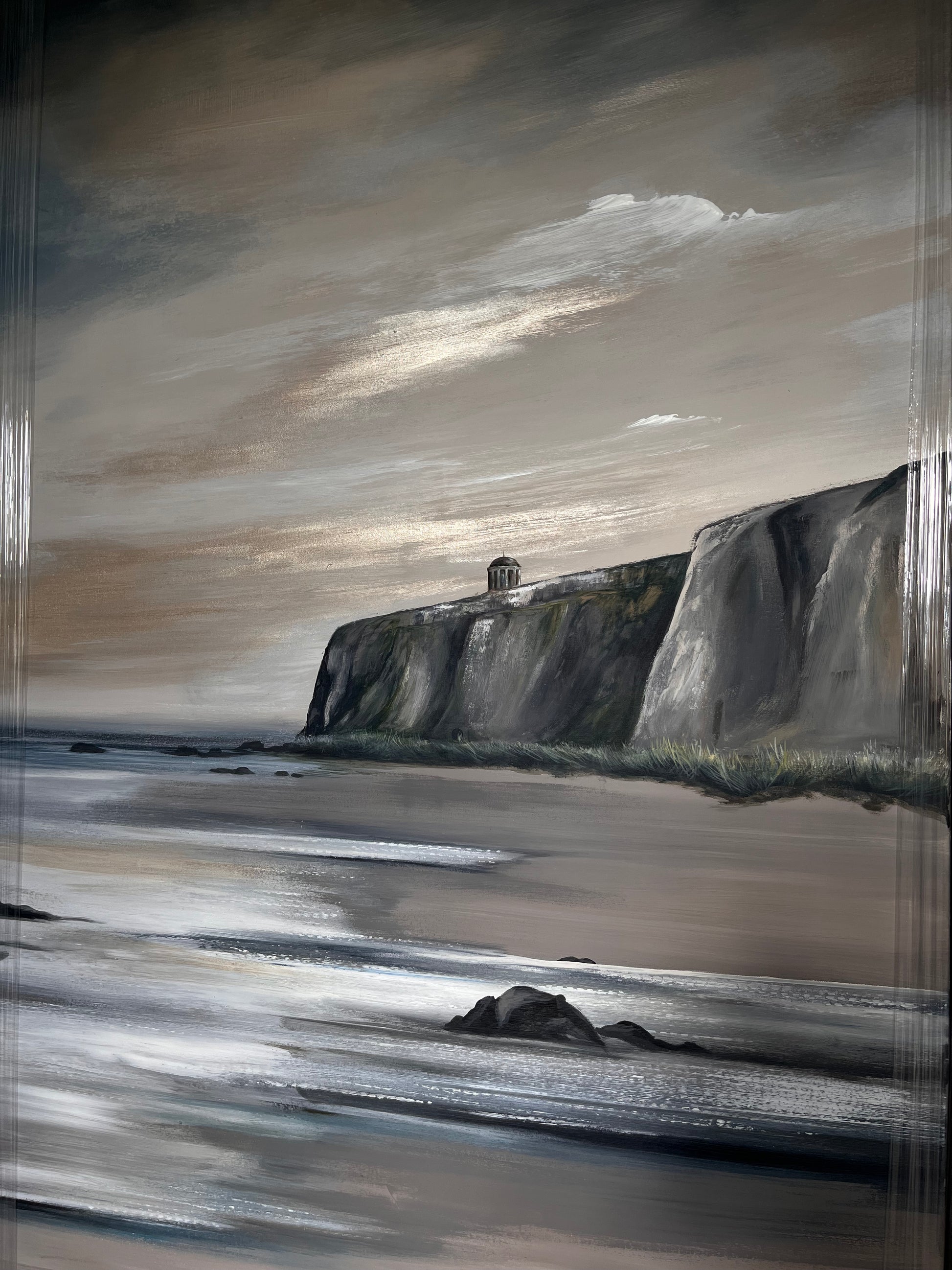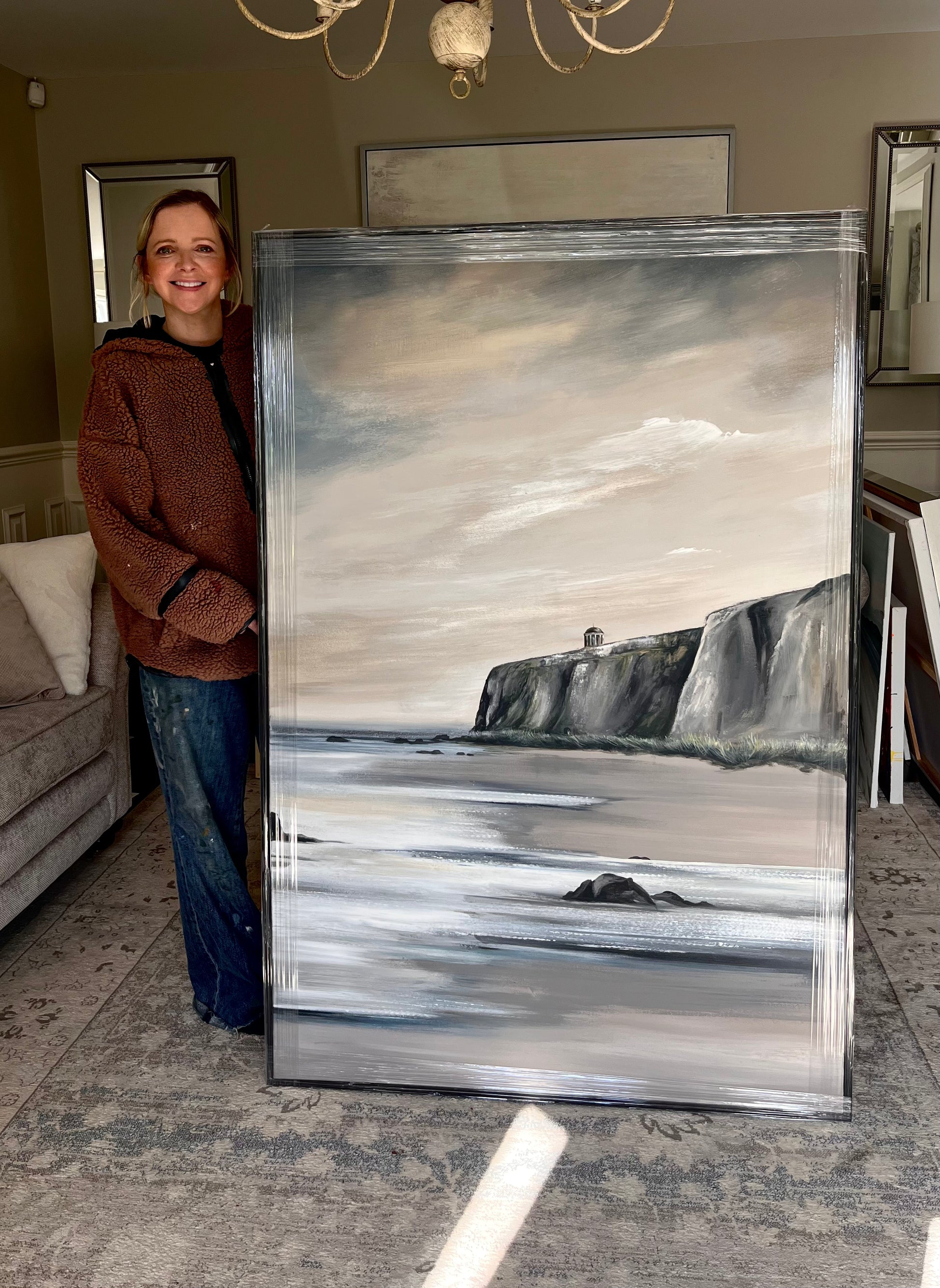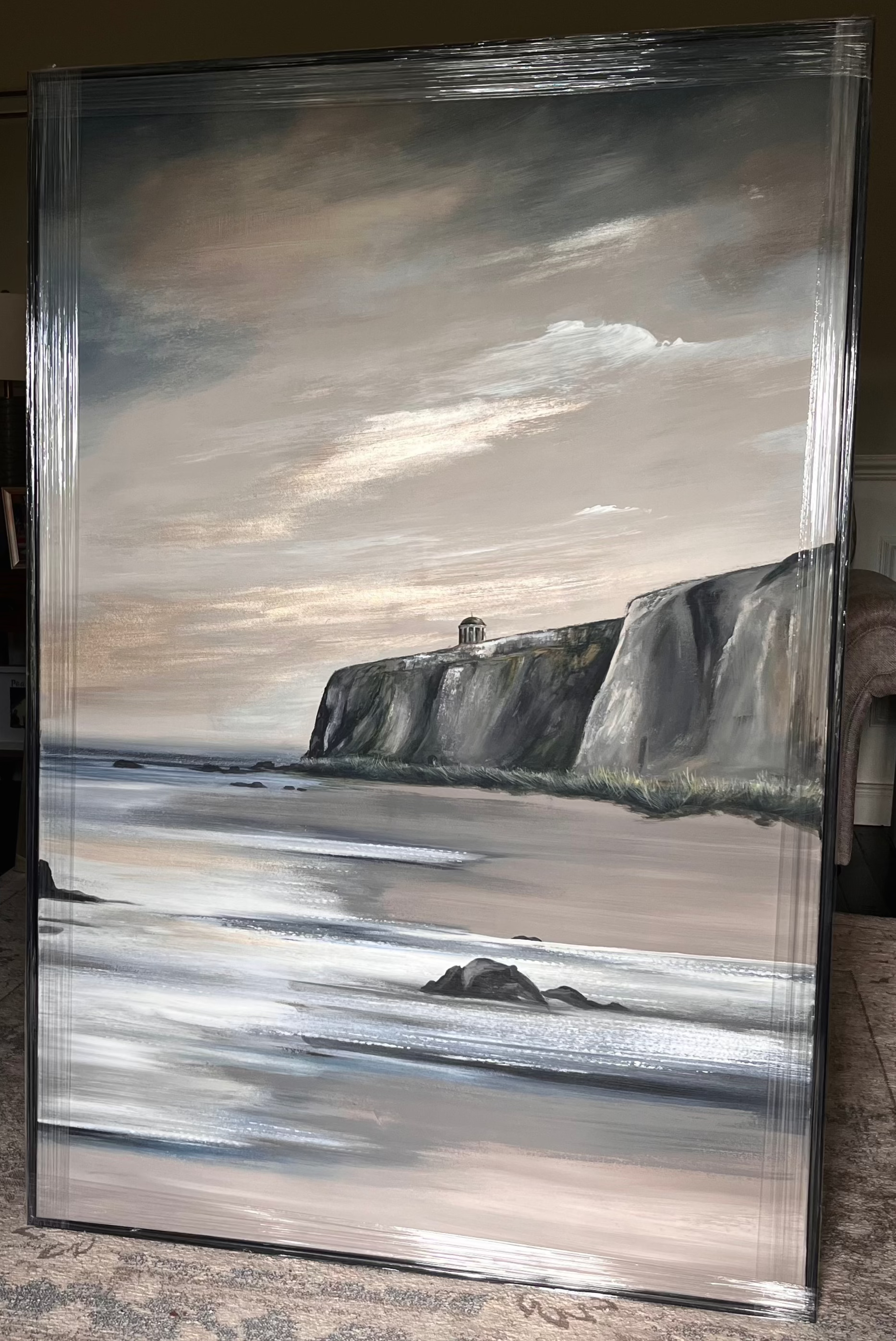Transform your space with the serene beauty of “Golden Reverie at Mussendun", a stunning 1.2m x 90cm original seascape painting. This mesmerising artwork captures the raw elegance of the shoreline, where rugged cliffs meet gentle waves under a soft, glowing sky. With a harmonious blend of earthy tones, deep greys, and warm golden hues, this piece radiates a sense of calm, making it the perfect focal point for any room.