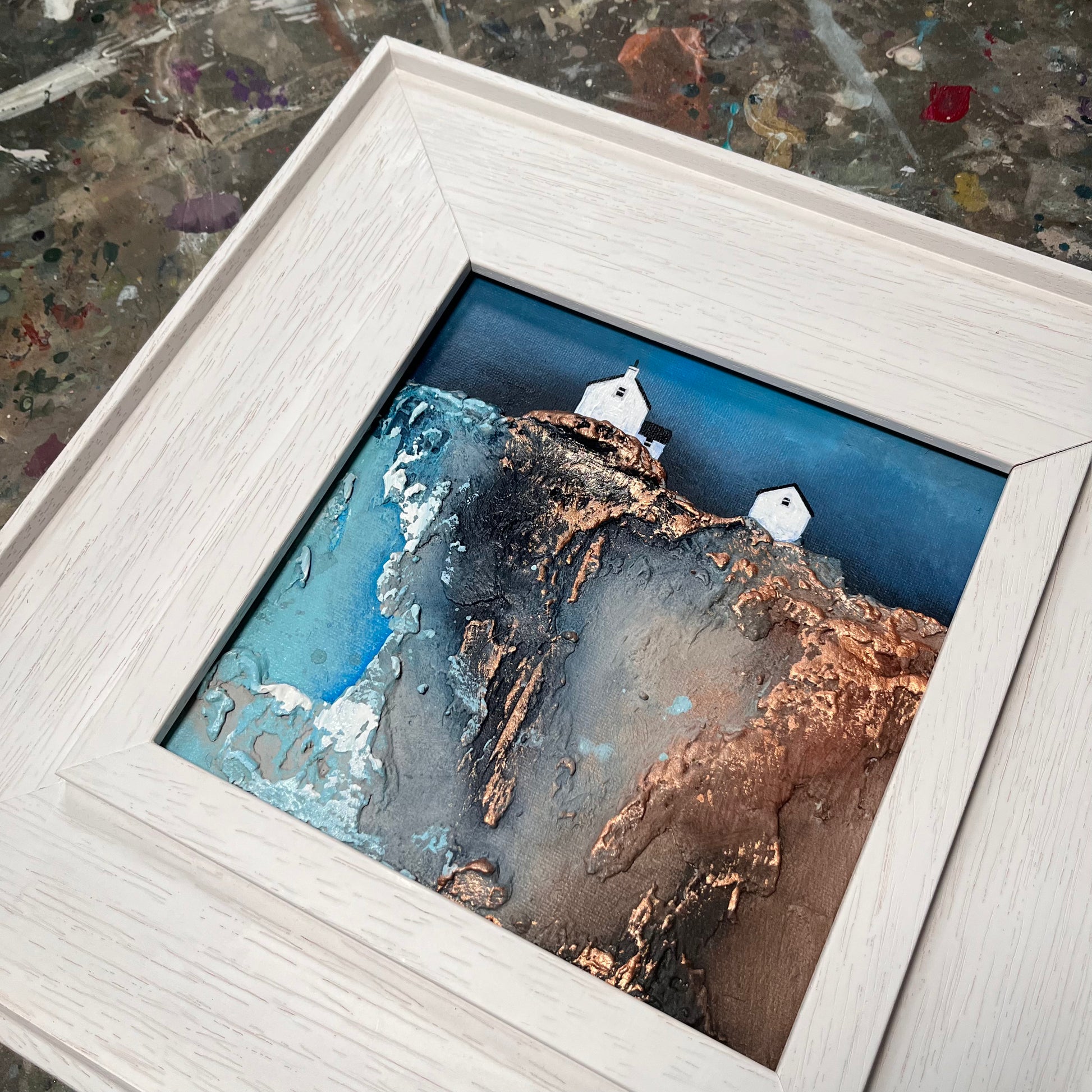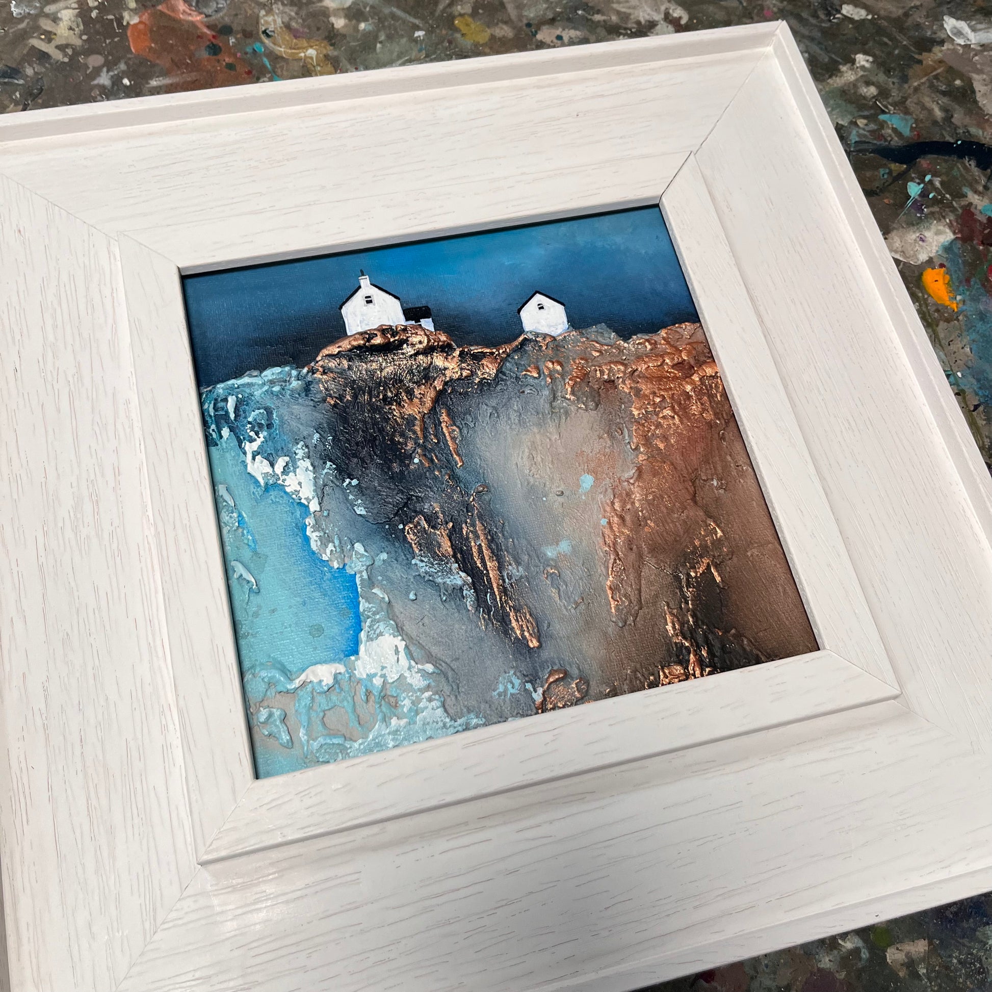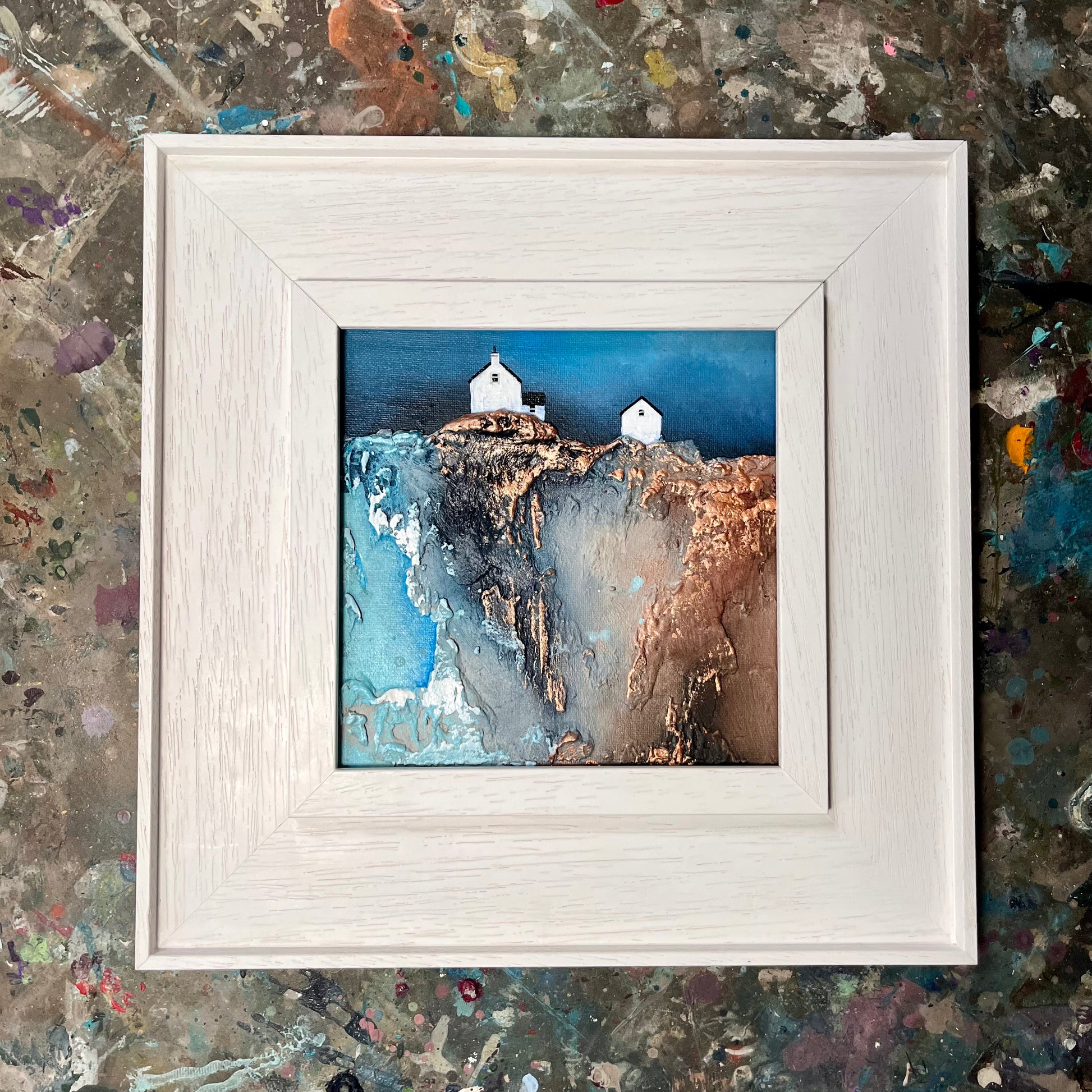 The piece draws from the visual language of childhood—rich textures, bold contrasts, and simplified forms—to evoke how the world once felt: larger, more mysterious, and filled with quiet beauty. The interplay between earthy tones and vivid blues emphasises the rugged charm of the landscape, while the solitary structure anchors the composition with a quiet presence.