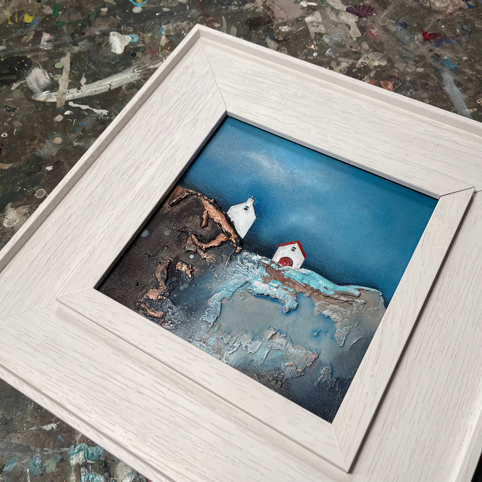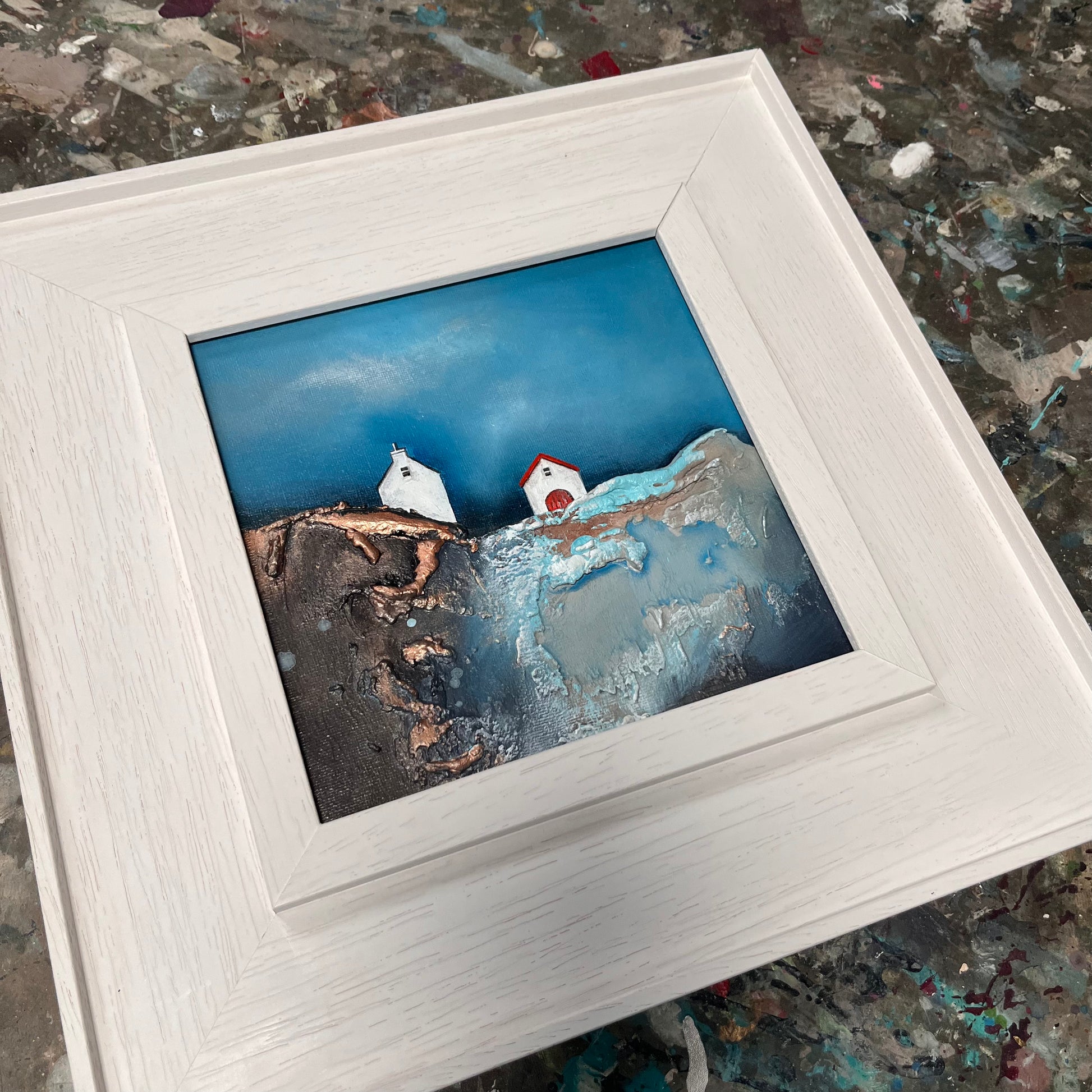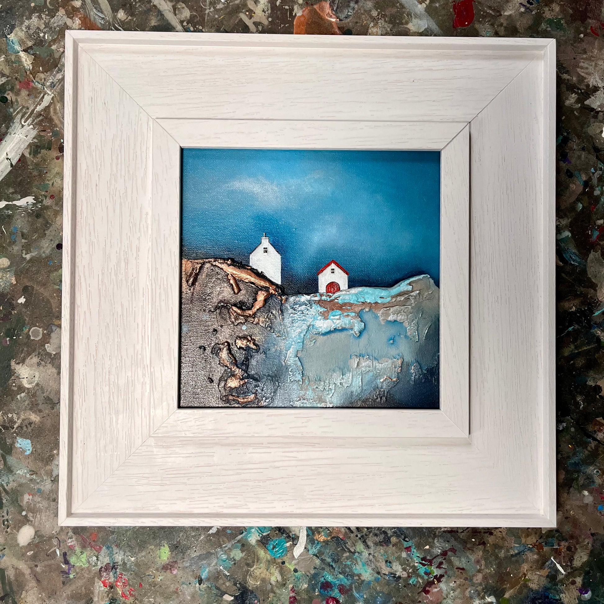 The piece draws from the visual language of childhood—rich textures, bold contrasts, and simplified forms—to evoke how the world once felt: larger, more mysterious, and filled with quiet beauty. The interplay between earthy tones and vivid blues emphasises the rugged charm of the landscape, while the solitary structure anchors the composition with a quiet presence.