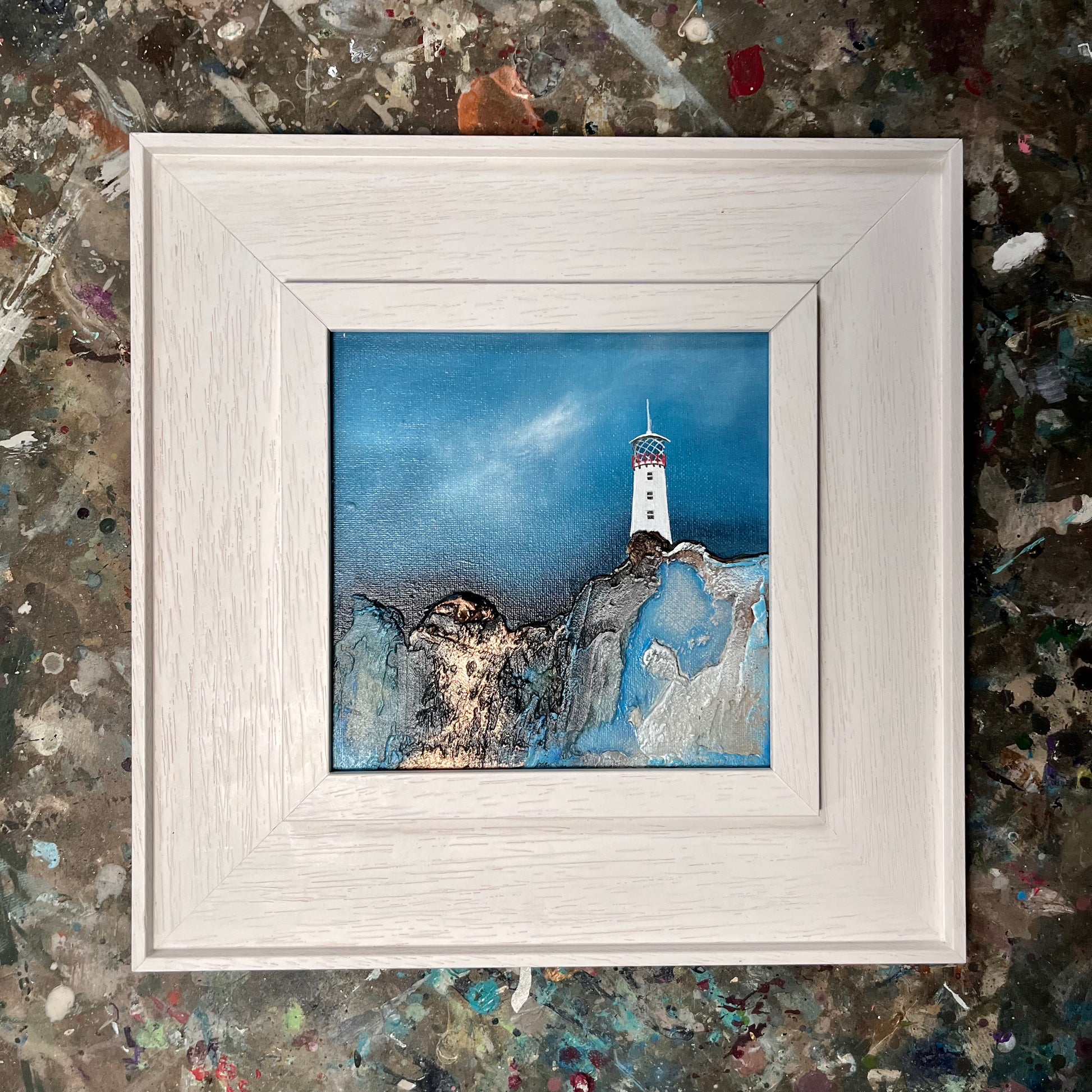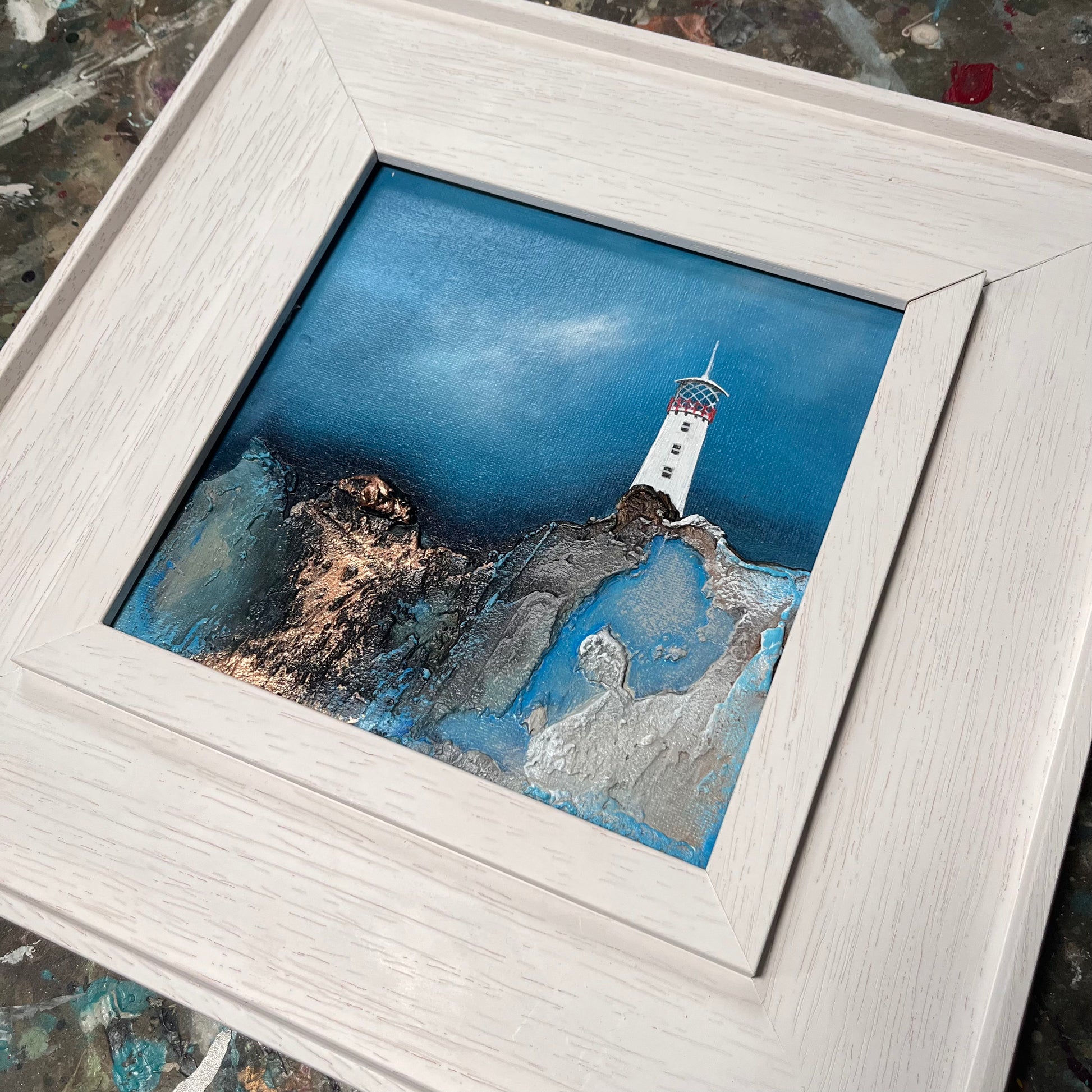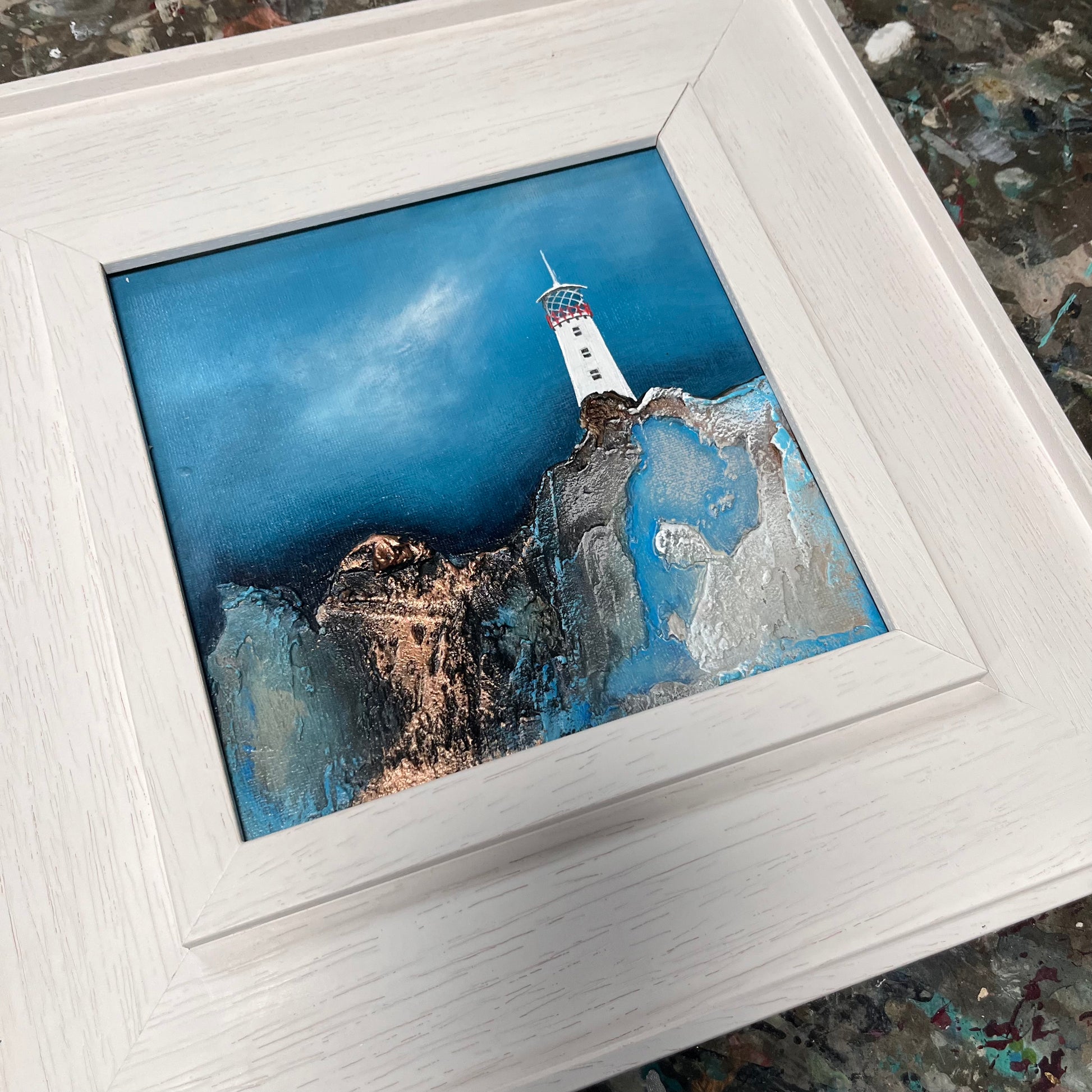 The piece draws from the visual language of childhood—rich textures, bold contrasts, and simplified forms—to evoke how the world once felt: larger, more mysterious, and filled with quiet beauty. The interplay between earthy tones and vivid blues emphasises the rugged charm of the landscape, while the solitary structure anchors the composition with a quiet presence.