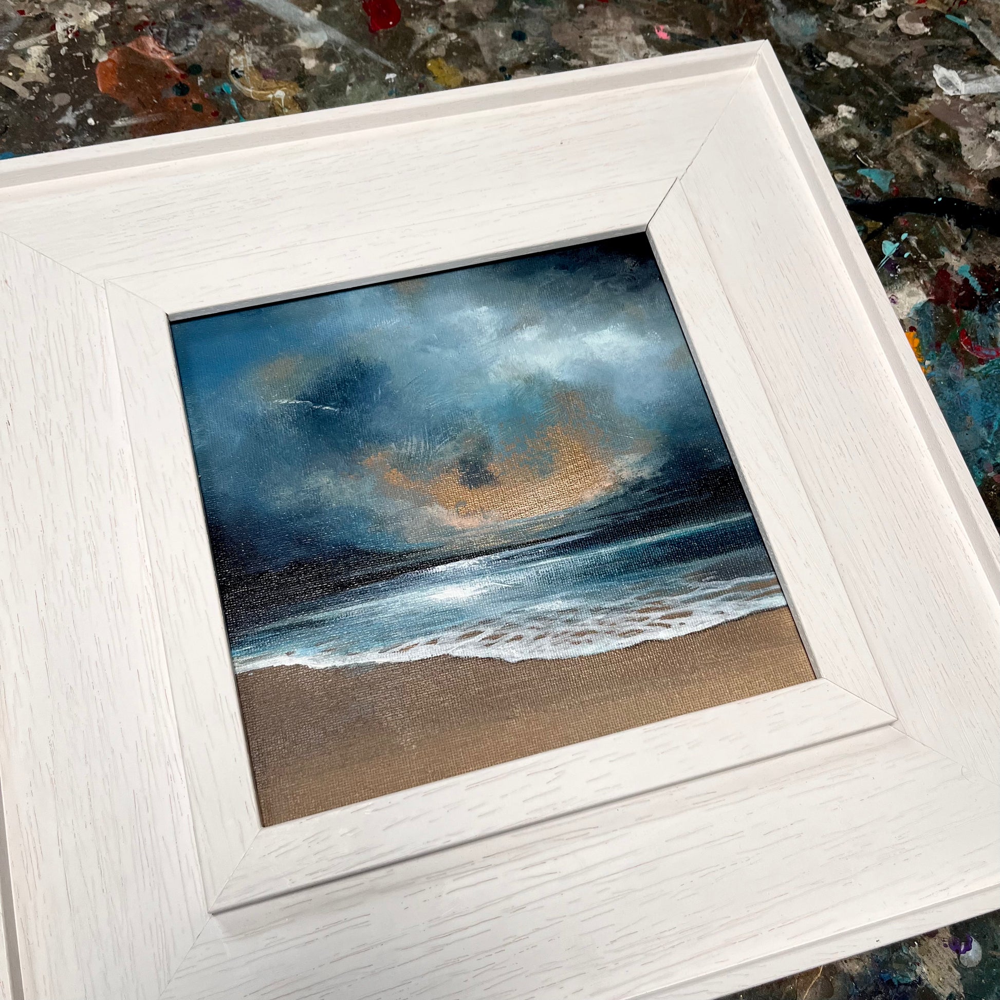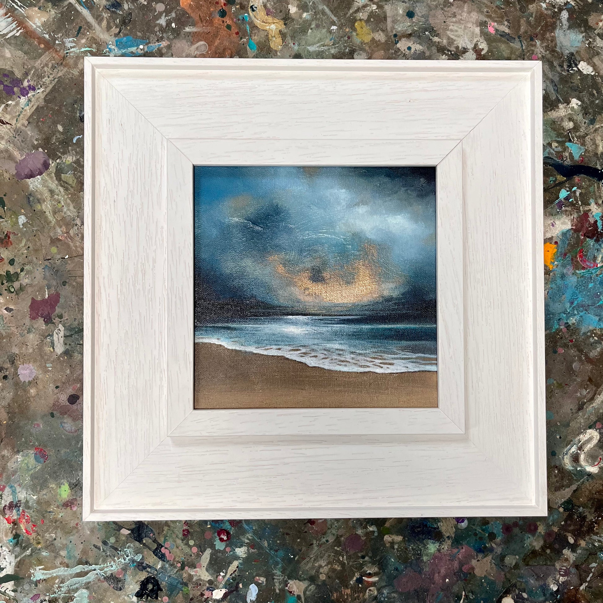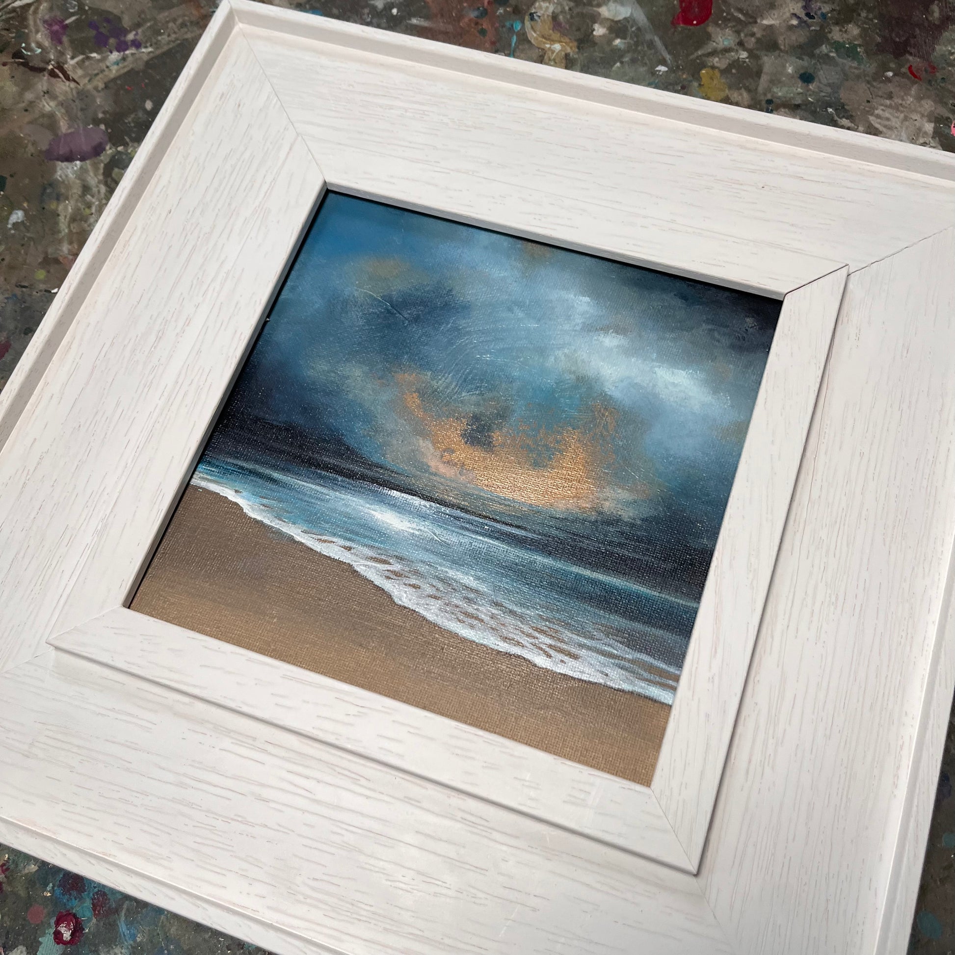 This framed 20x20cm canvas captures the atmosphere of a misty Irish shoreline, where sea foam drifts across the foreground beneath a soft, moody sky. A hand-painted gold horizon line brings a subtle glow and contrast, suggesting light breaking through the haze. Compact in scale yet full of texture and depth, this piece evokes the quiet drama of the Atlantic coast on a shifting day.