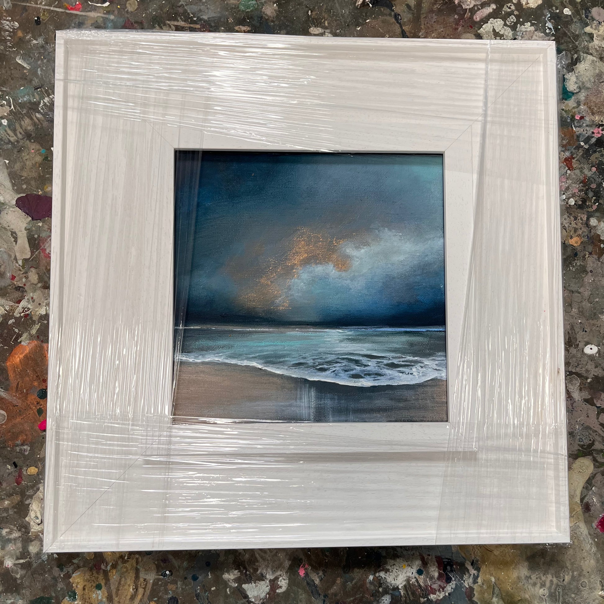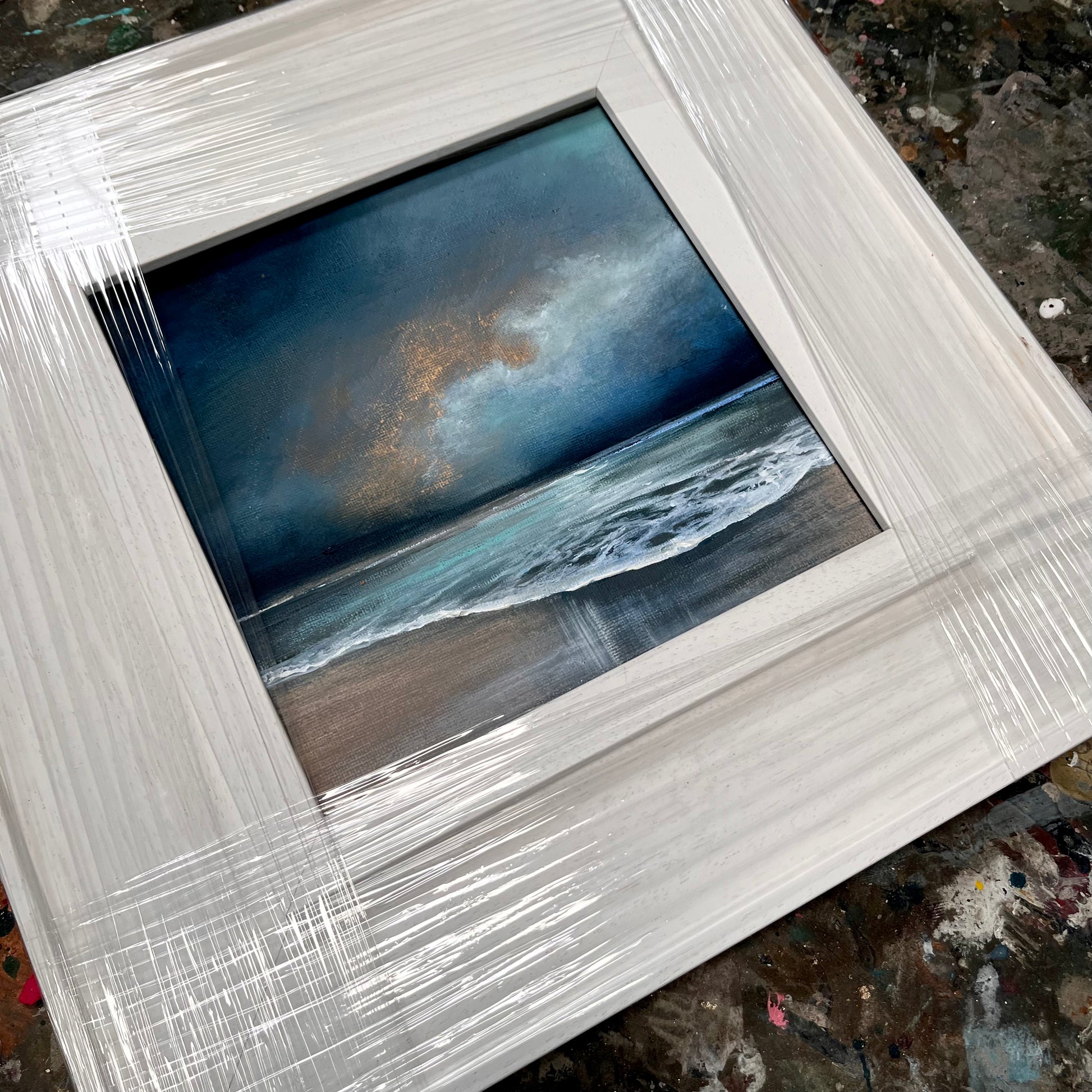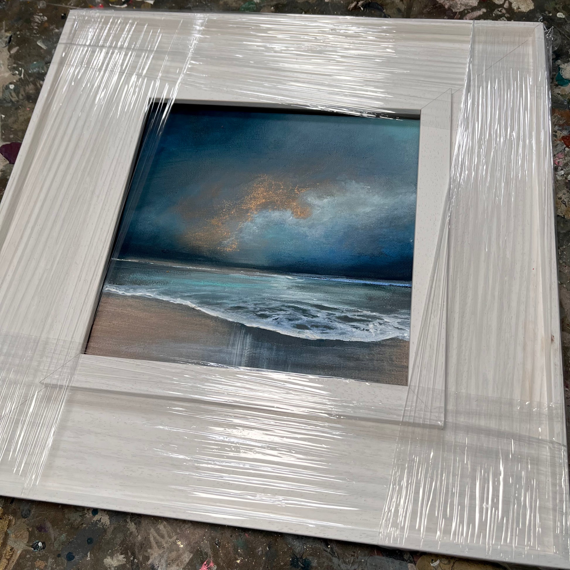 A framed seascape capturing rolling waves beneath a dark sky, with soft light breaking on the horizon. Atmospheric, calming, and ready to hang.
