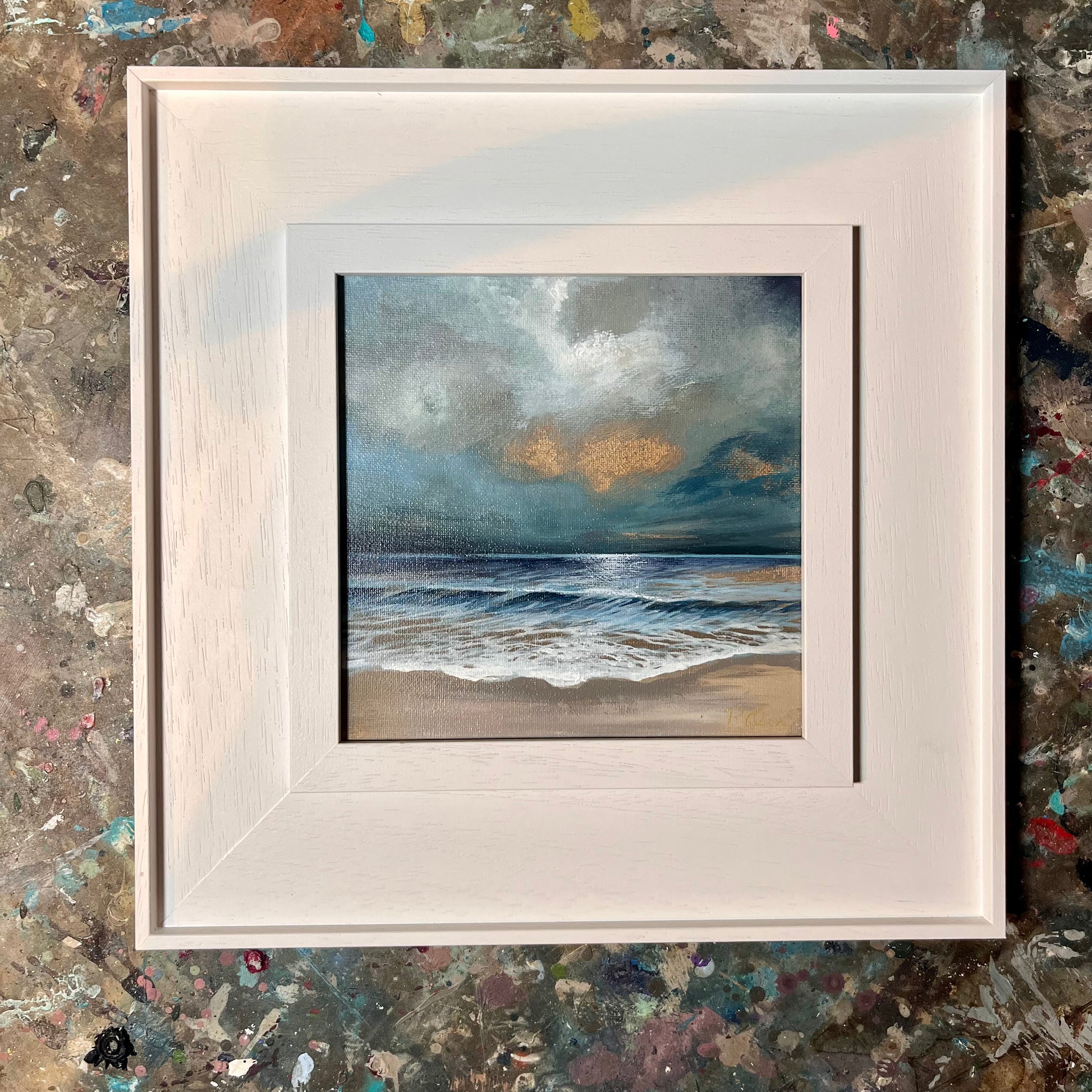 This framed 20x20cm canvas captures the atmosphere of a misty Irish shoreline, where sea foam drifts across the foreground beneath a soft, moody sky. A hand-painted gold horizon line brings a subtle glow and contrast, suggesting light breaking through the haze. Compact in scale yet full of texture and depth, this piece evokes the quiet drama of the Atlantic coast on a shifting day.