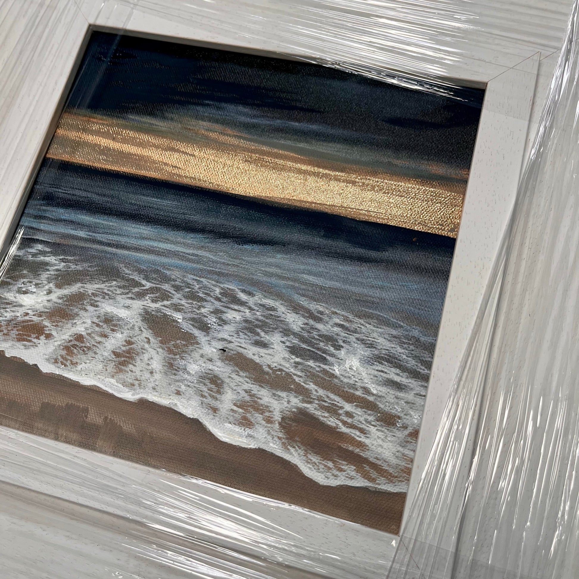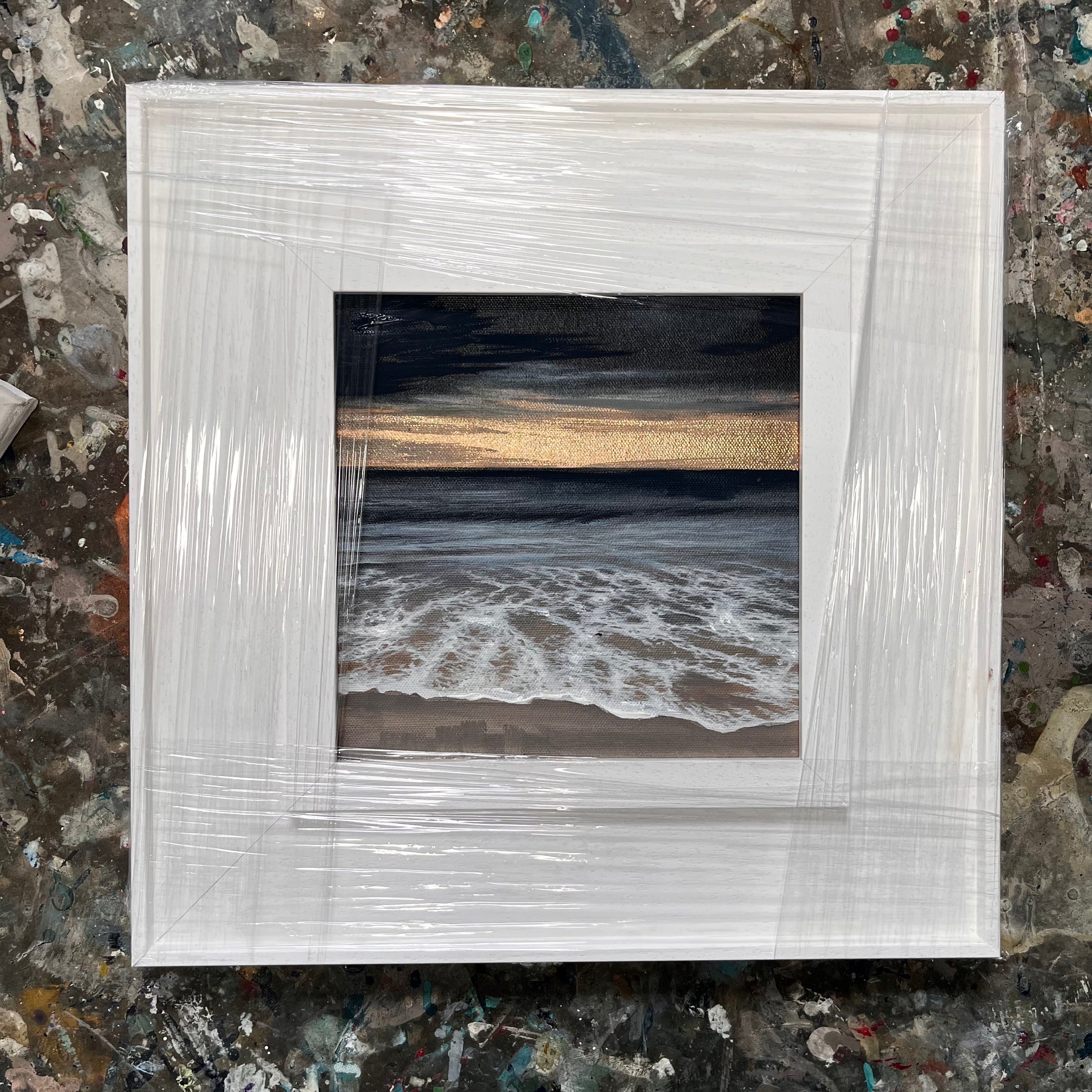 A framed seascape capturing rolling waves beneath a dark sky, with soft light breaking on the horizon. Atmospheric, calming, and ready to hang.