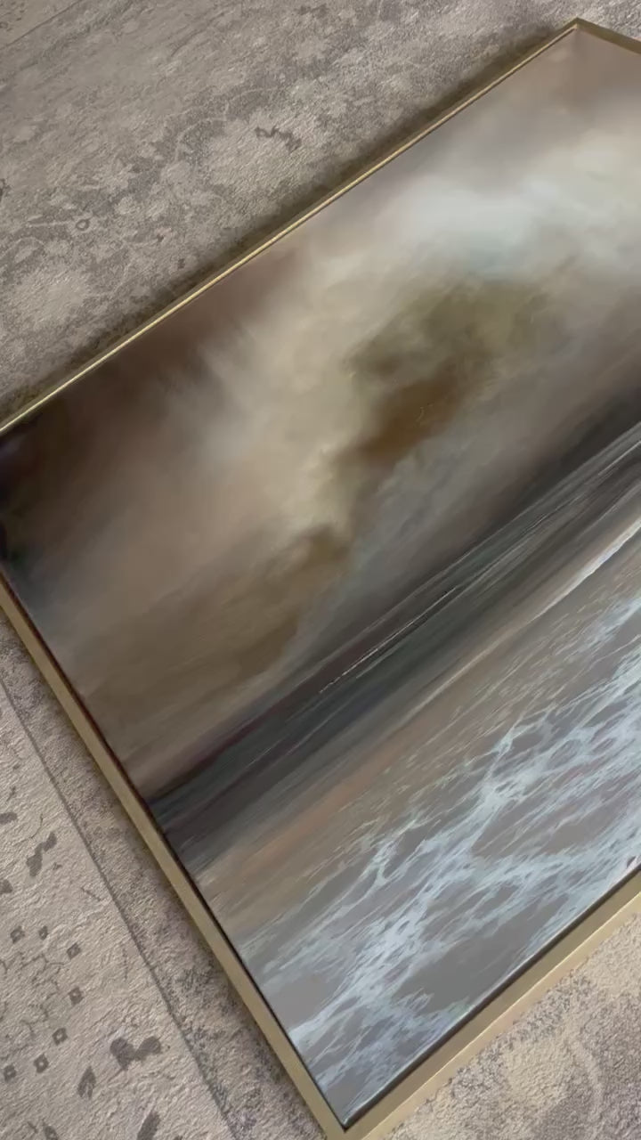A beautifully neutral toned seascape, created with rich layers and subtle colour transitions. The light within the cloud shifts gently through warm tones, bringing a soft golden glow to the horizon. The sweeping shoreline adds texture and movement, making this an impactful centrepiece for your wall.
